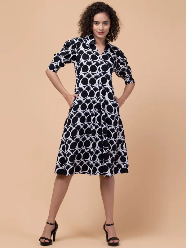 Black & White Printed Shirt Dress – Stylish Long Sleeve Collared Poly Crepe Dress with Elastic Waist