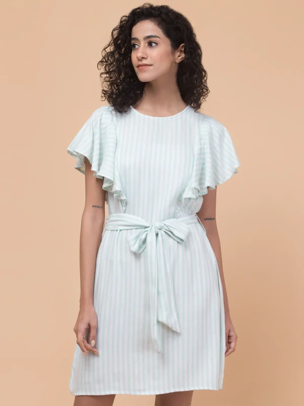 Sea Green Rayon Stripe A-Line Dress with Ruffle Sleeves