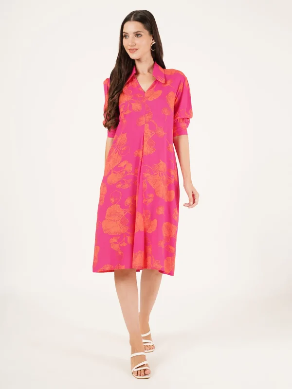 Multicolor Floral Shirt Collar Dress with 3/4 Sleeves-Rayon Fabric