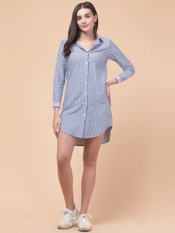 Grey Striped Rayon Shirt Dress – Stylish Casual Long Sleeve Button-Down Dress