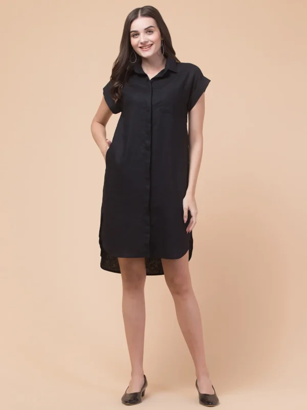 Hive91 Women’s Black Linen Blend Shirt Dress with Cap Sleeves and Shirt Collar