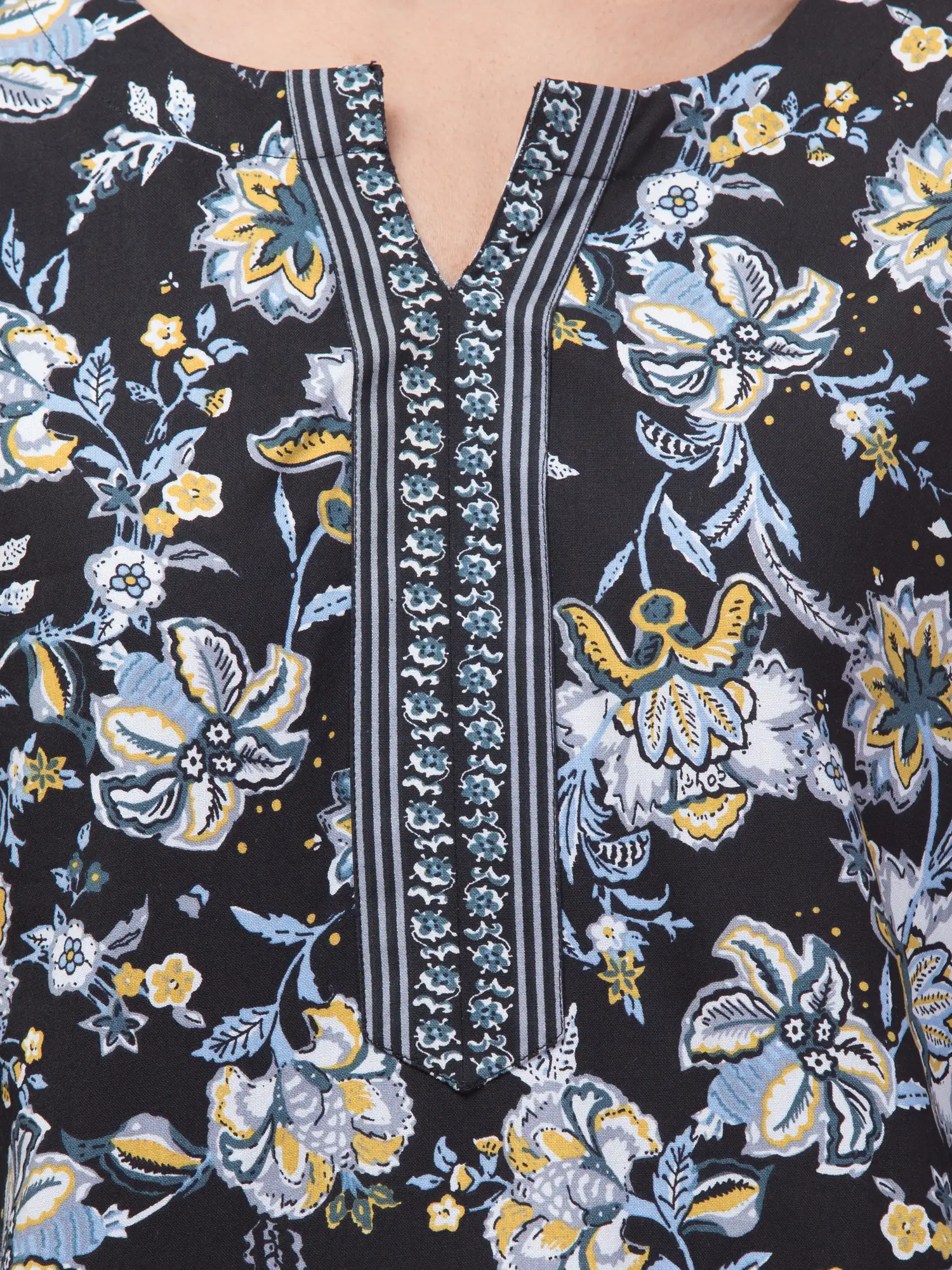Elevate your style with Hive91’s Grey Floral Rayon Kurti, featuring 3/4 sleeves and a regular fit. Perfect for casual outings or festive occasions.