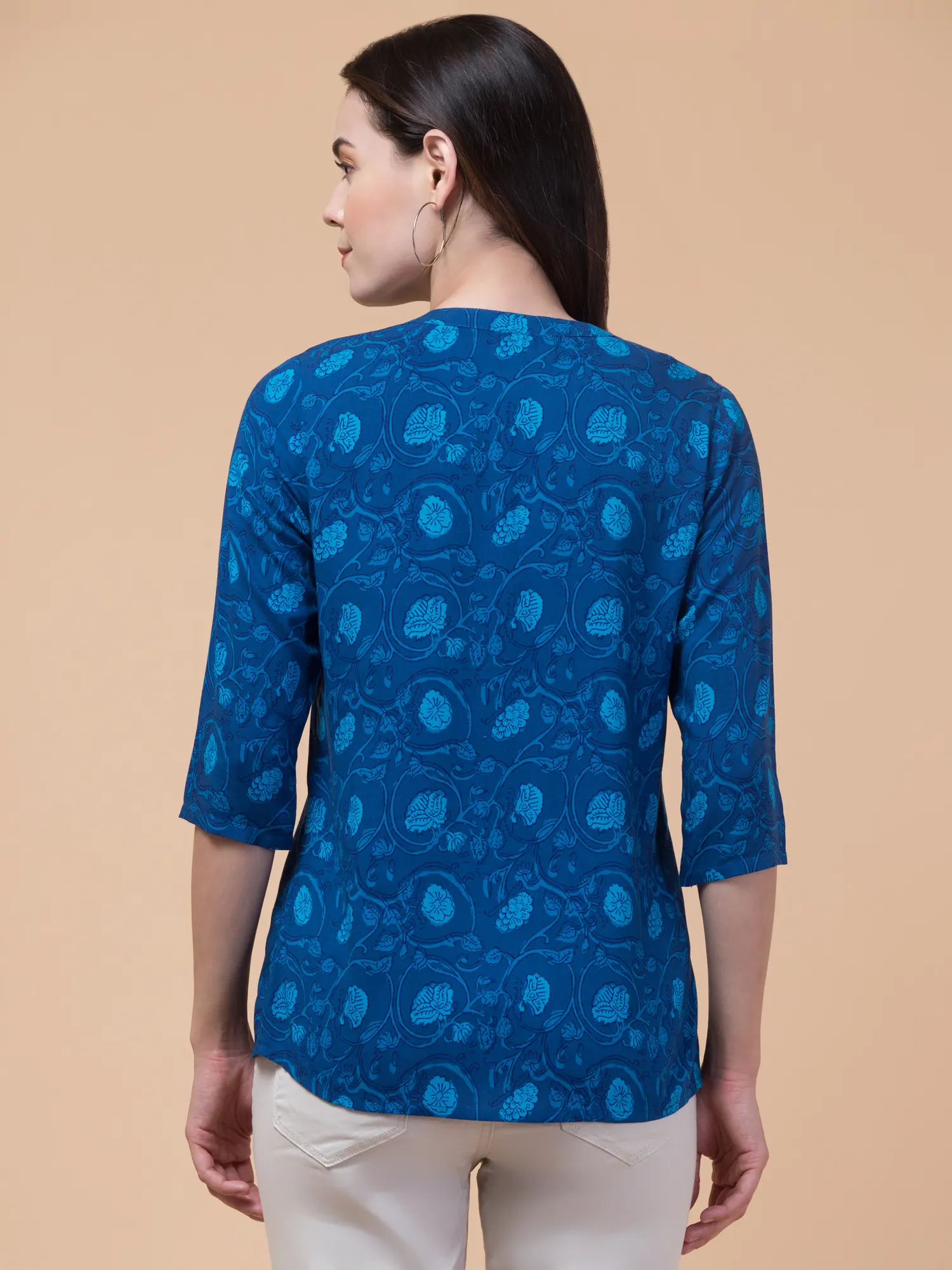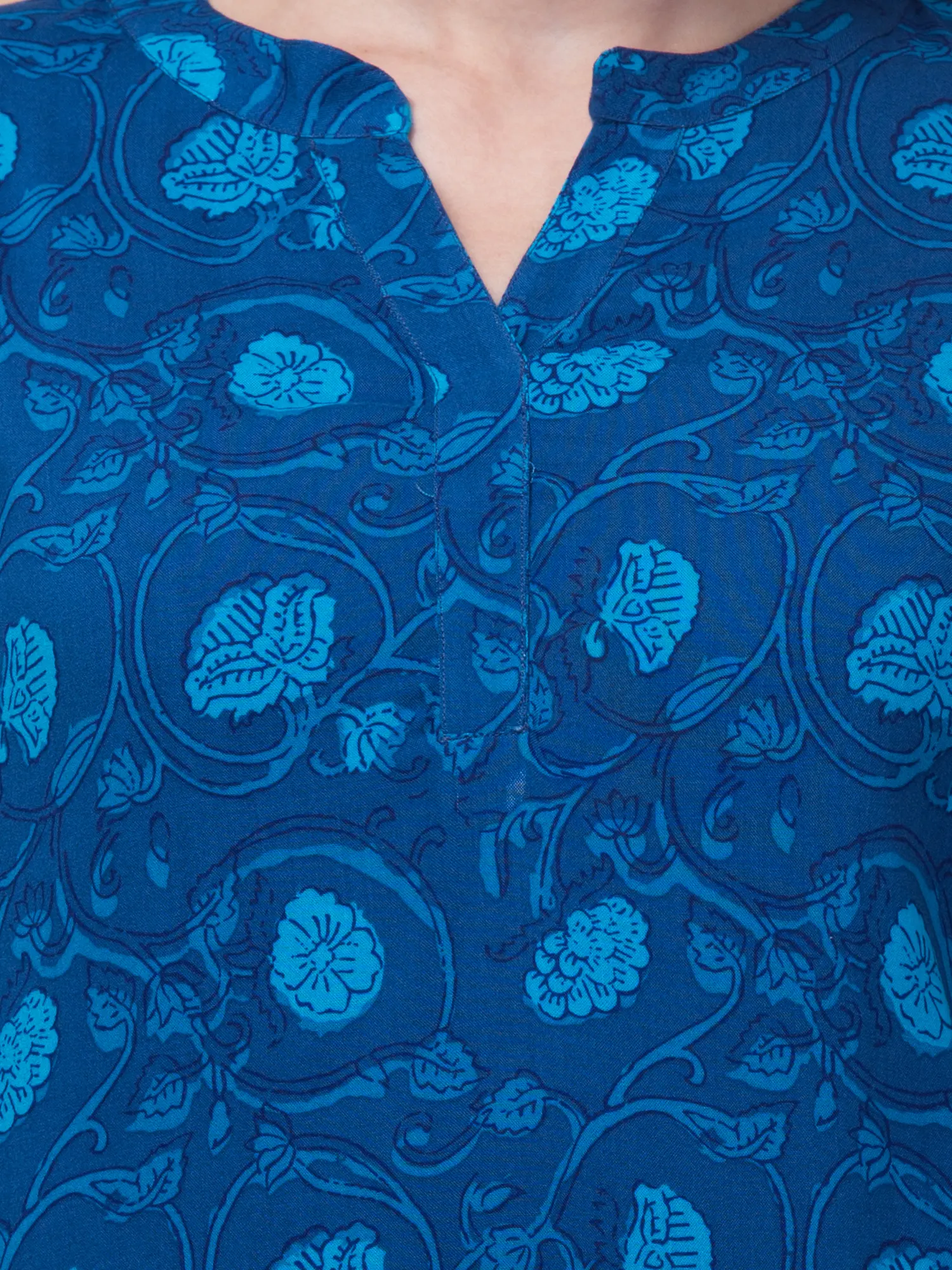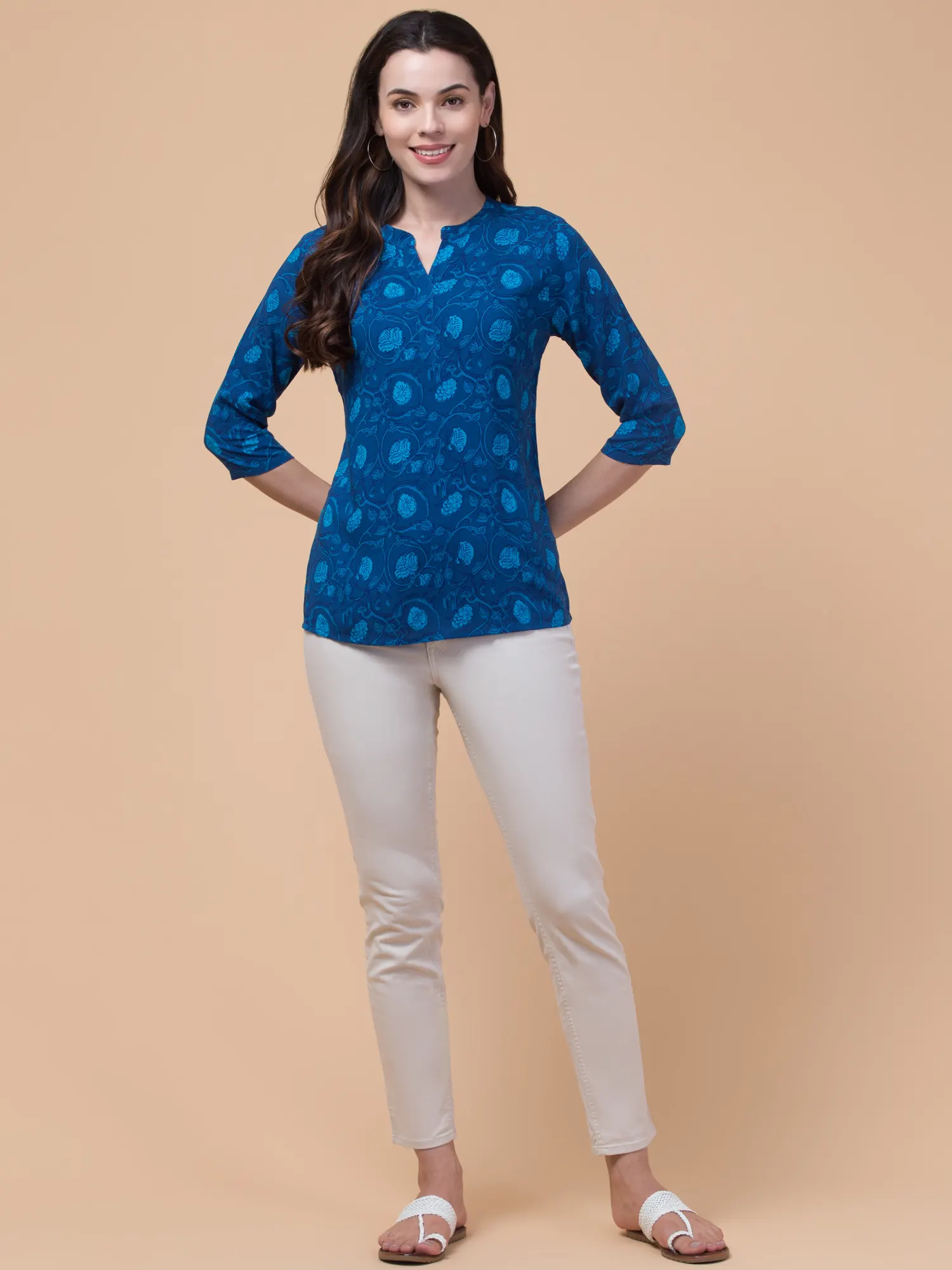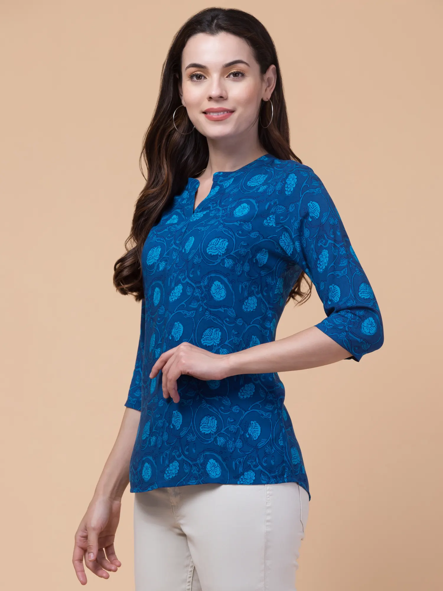 Discover everyday elegance with Hive91’s blue floral kurti top, a beautiful blend of tradition and trend. Tailored from lightweight and breathable rayon fabric, this short kurti top features a charming floral print that adds grace to your daywear. The Mandarin collar offers a touch of classic sophistication, while the 3/4 sleeves and regular fit ensure comfort through every season.