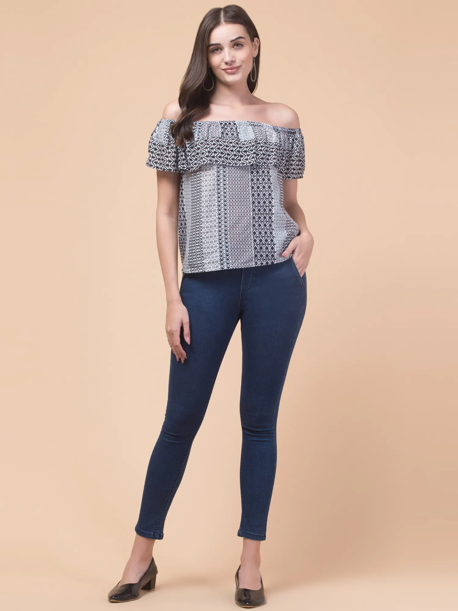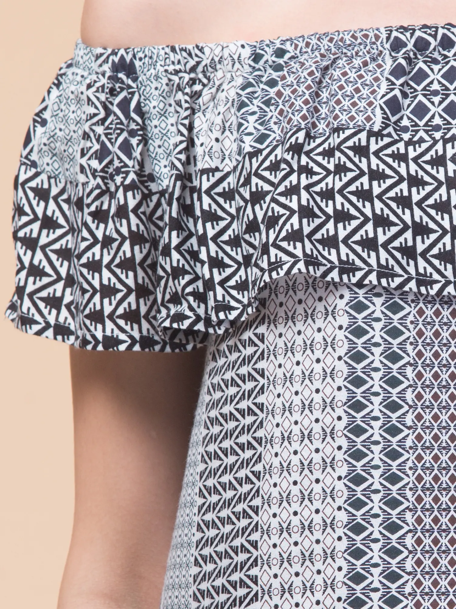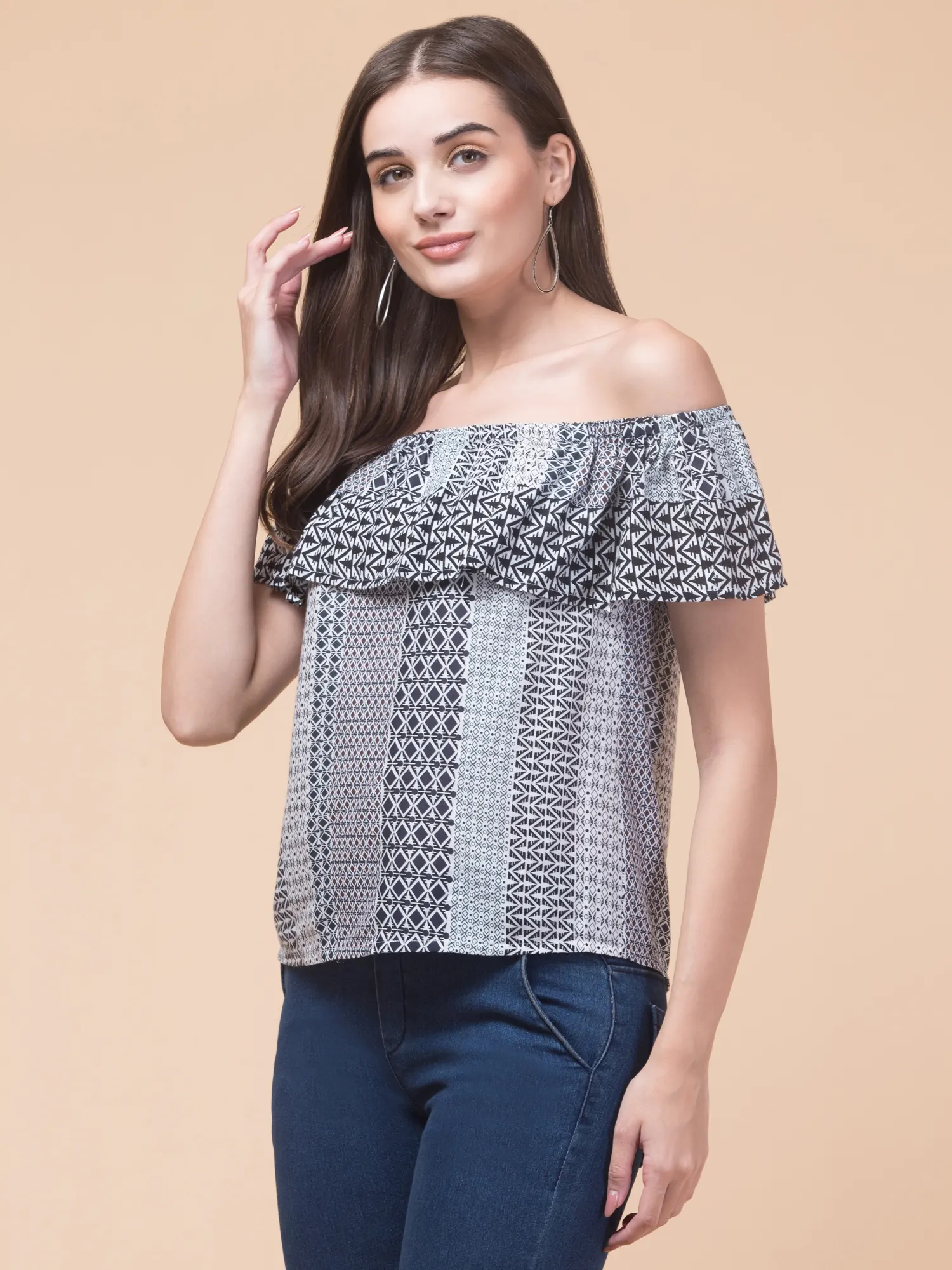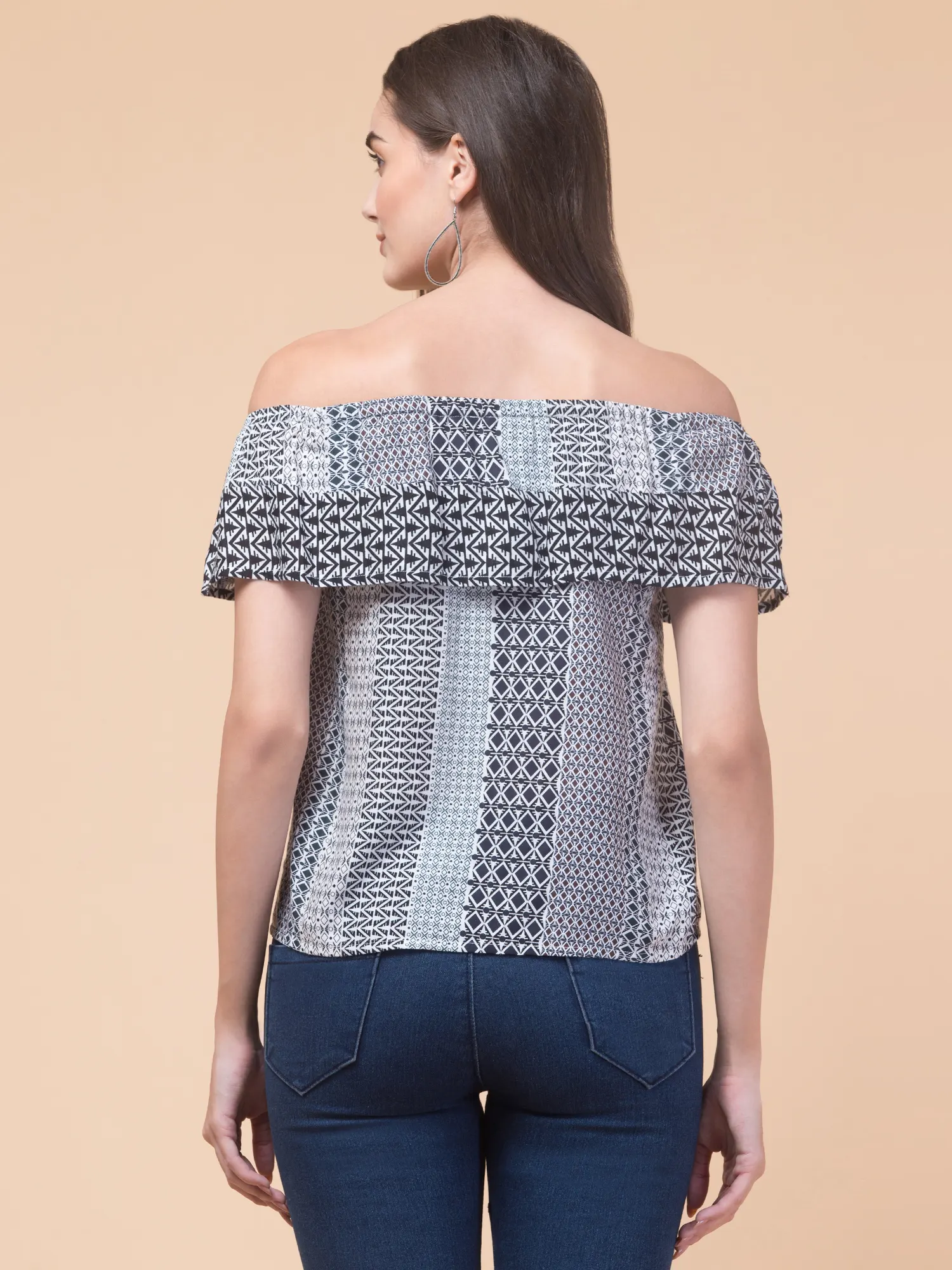 Upgrade your wardrobe with this abstract off shoulder top for women—a must-have for every fashion-forward woman.