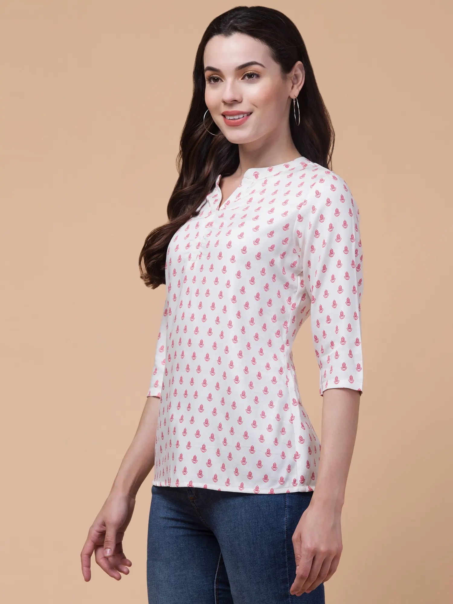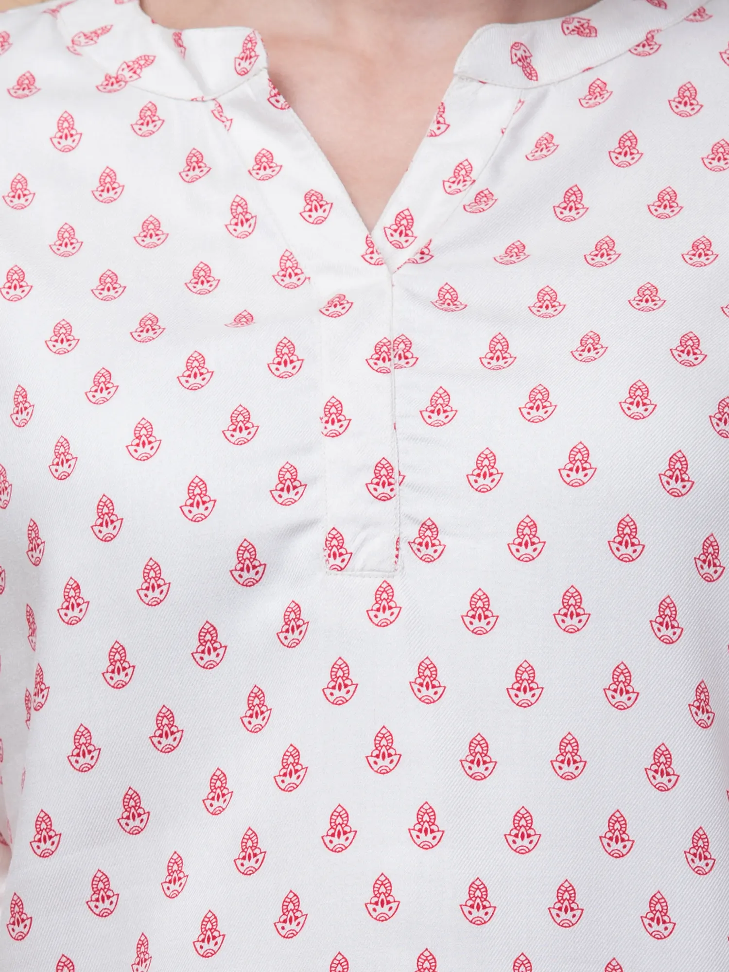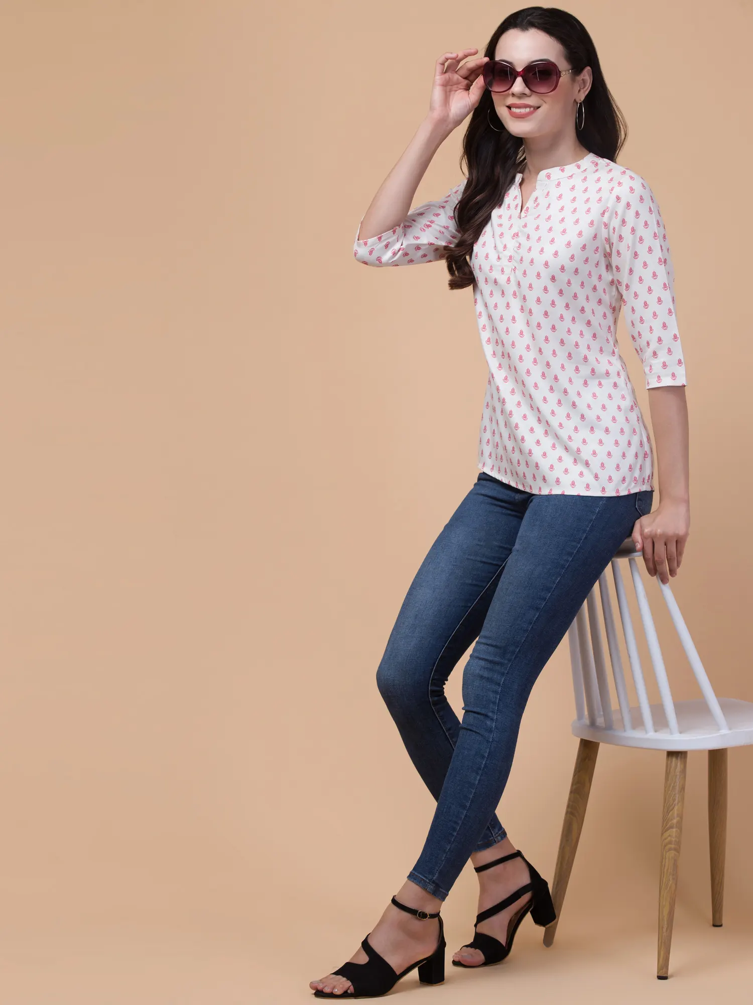 Add a touch of timeless charm to your everyday wardrobe with Hive91’s off-white floral kurti top. Crafted from soft rayon fabric, this short kurti is lightweight, breathable, and designed to keep you stylish all day long. The subtle floral print gives it a fresh and graceful look, while the Mandarin collar and 3/4 sleeves add a refined finish.