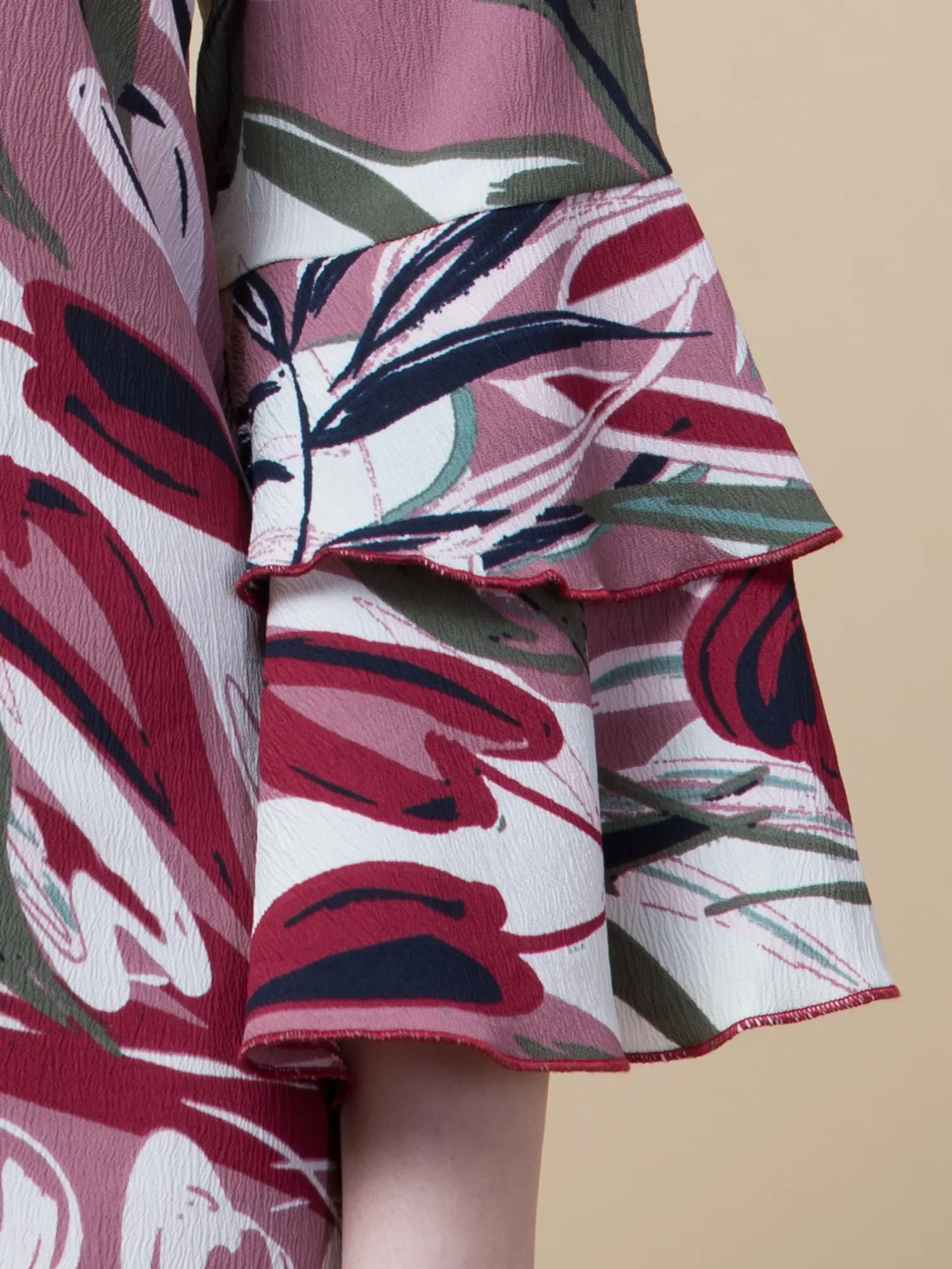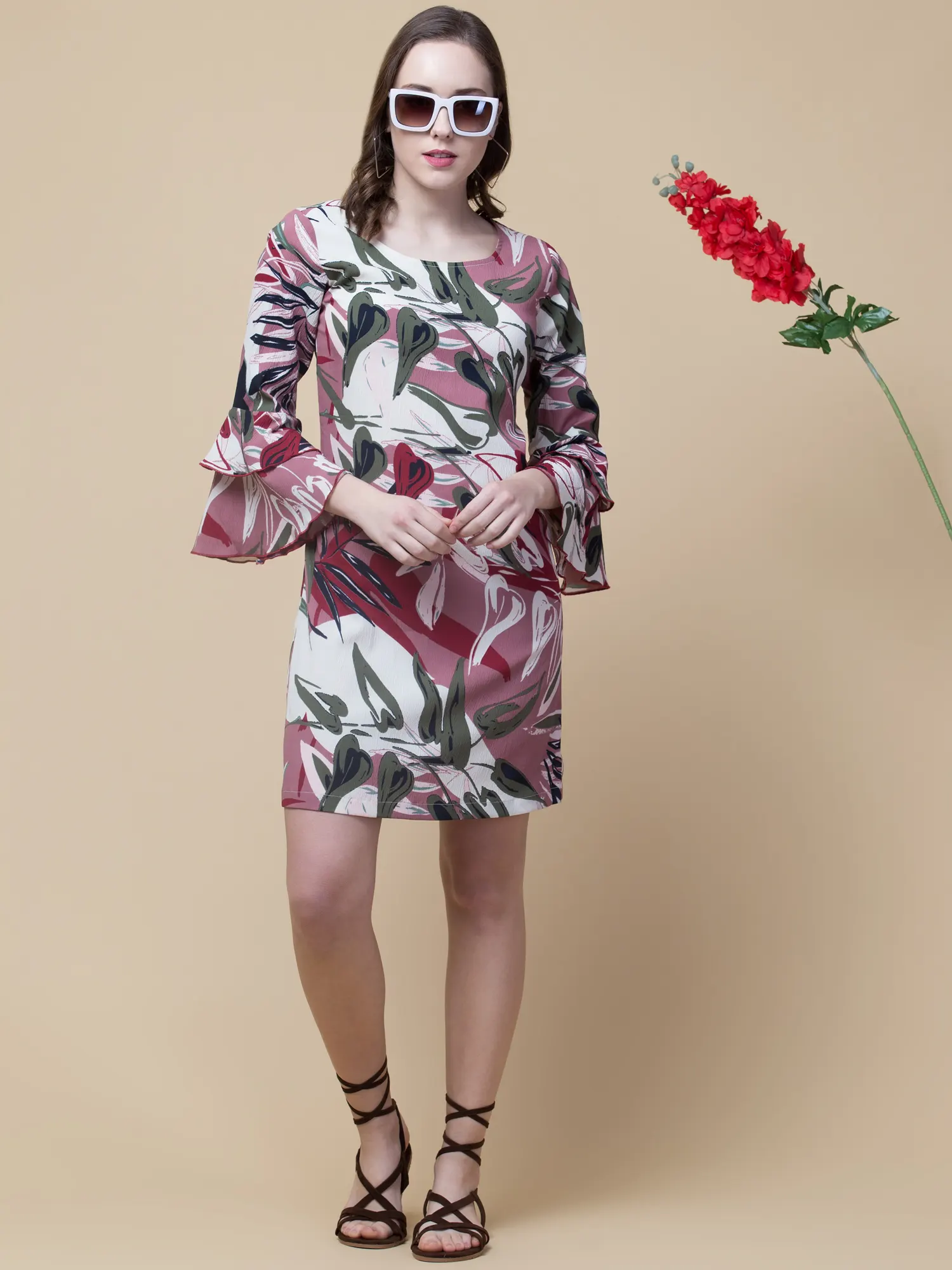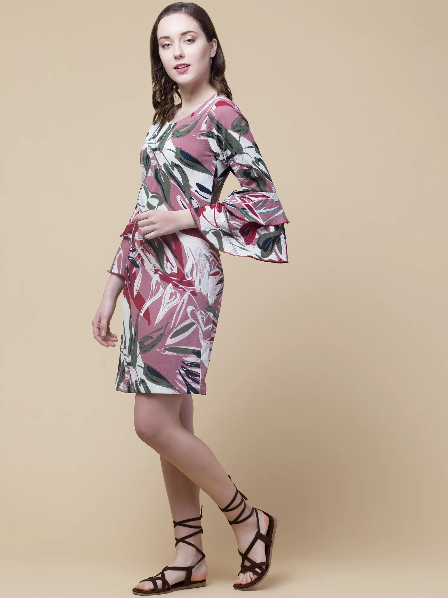 A knee-length dress gives you a bold look. This floral multi colour knee-length dress is made of Poly Georgette Fabric and ruffles layered sleeves design. The approx. length of the party dress is 46 inches, 3/4th Ruffle Sleeve Knee Length Dress.