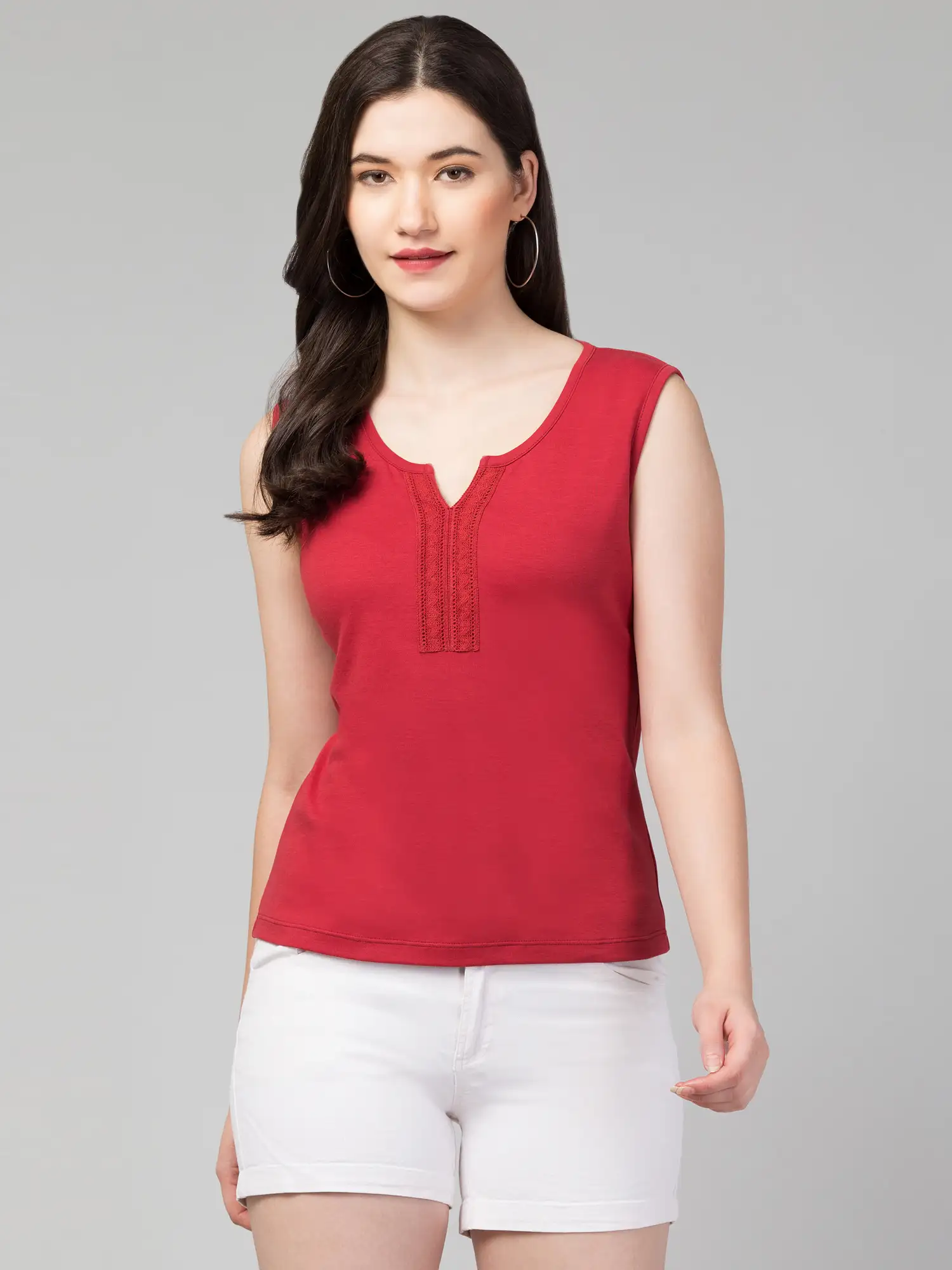 Elevate your wardrobe with our Maroon Sleeveless Cotton Jersey Spandex Top. Made with a blend of cotton and spandex, this top offers a comfortable and flattering fit. The solid maroon color makes it a versatile piece that can be dressed up or down. Perfect for warmer weather, this sleeveless top is easy to layer under a cardigan or blazer for a more polished look. Add this essential piece to your collection today and enjoy its soft, breathable fabric all year round.