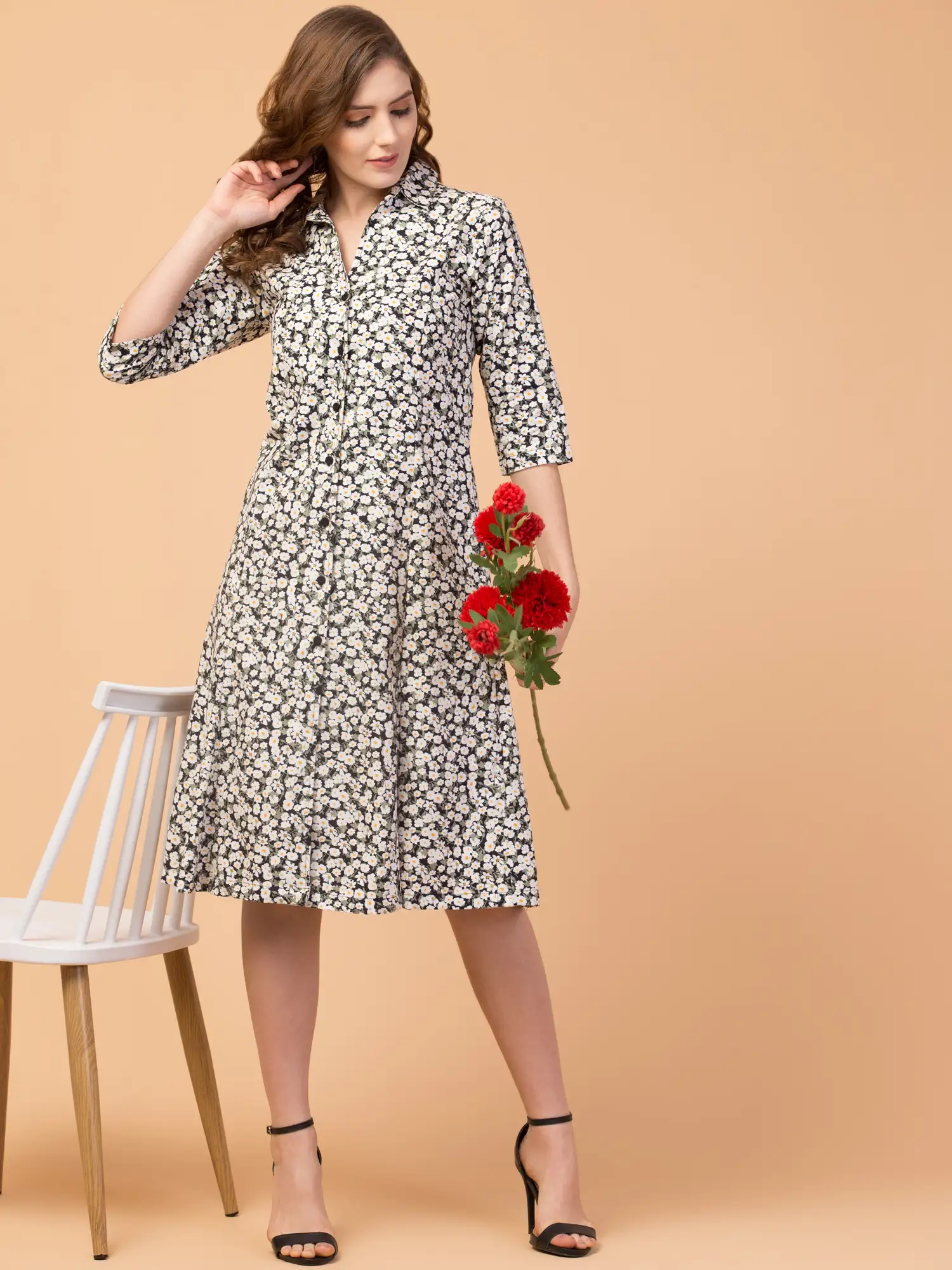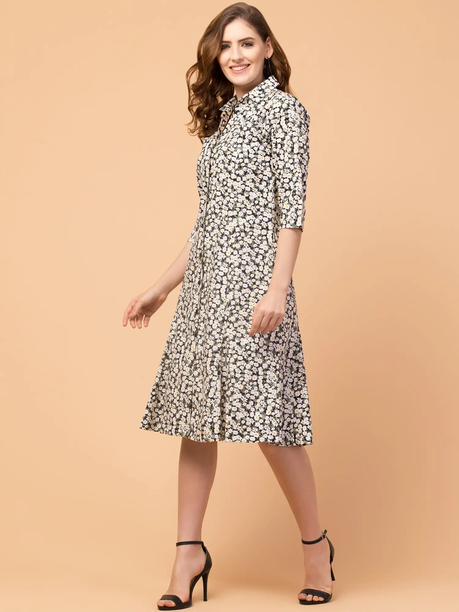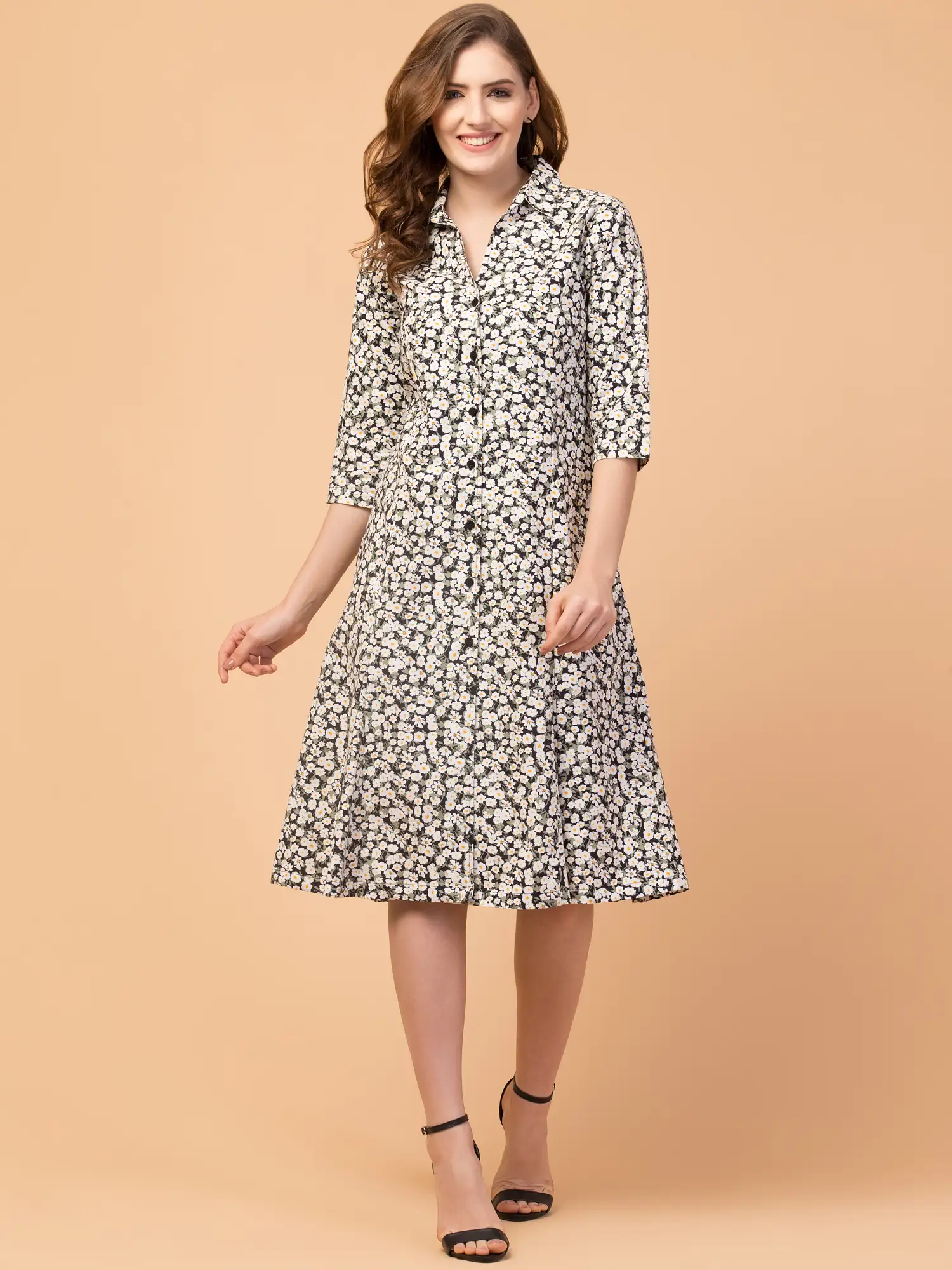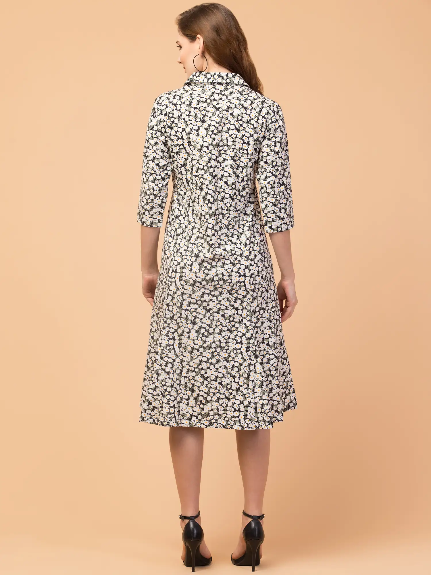 Get your hand with this trendy multicolor Floral printed knee-length A-line dress from the house of Hive91. This is a relaxed-fit printed A-line dress with a shirt collar made of rayon fabric. Brand color: multicolor, Fabric: Rayon,3/4 Sleeve, relaxed fit, Approx Length: 42 Inches. Front button closure.