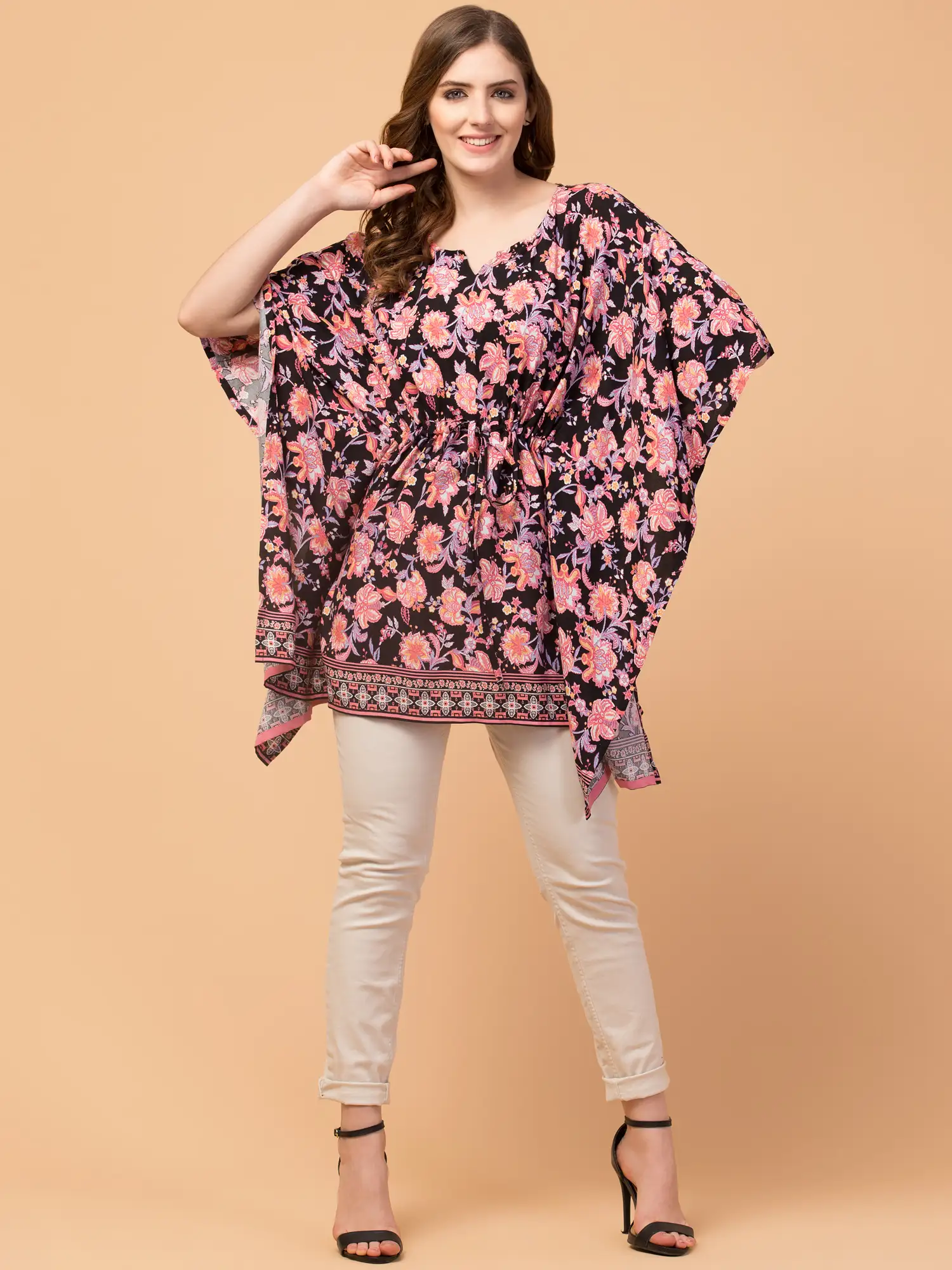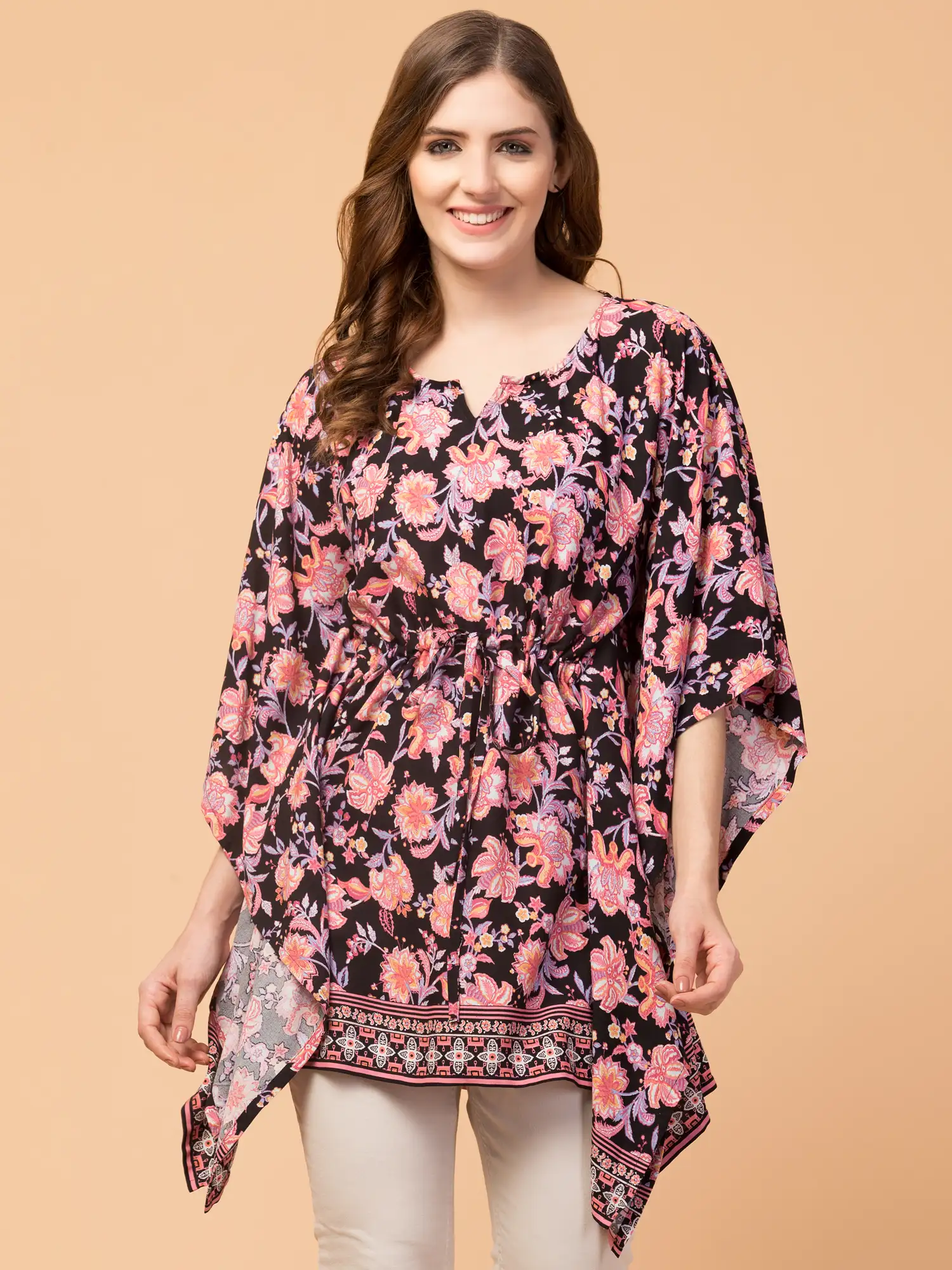 Get this awesome floral Printed Kaftan Poncho from the house of Hive91. It’s super comfortable along with being super ravishing. The Approx length of this kaftan poncho is 33 Inches. This Kaftan made of rayon fabric comes in a waist belt for a perfect fit.