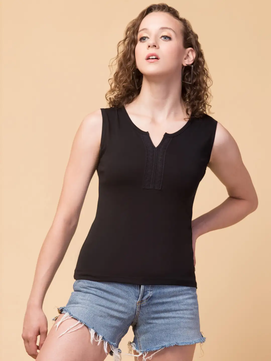 Get your hand with this trendy Black Casual top with lace finishing on the neckline from the house of Hive91. This is a relax fit top which made in knitted cotton fabric. Just slip this Black top with your favorite jeans and turn on the charming side of you. Brand colour: Black, fabric : knitted cotton, sleeveless, Relax Fit Tank Top.