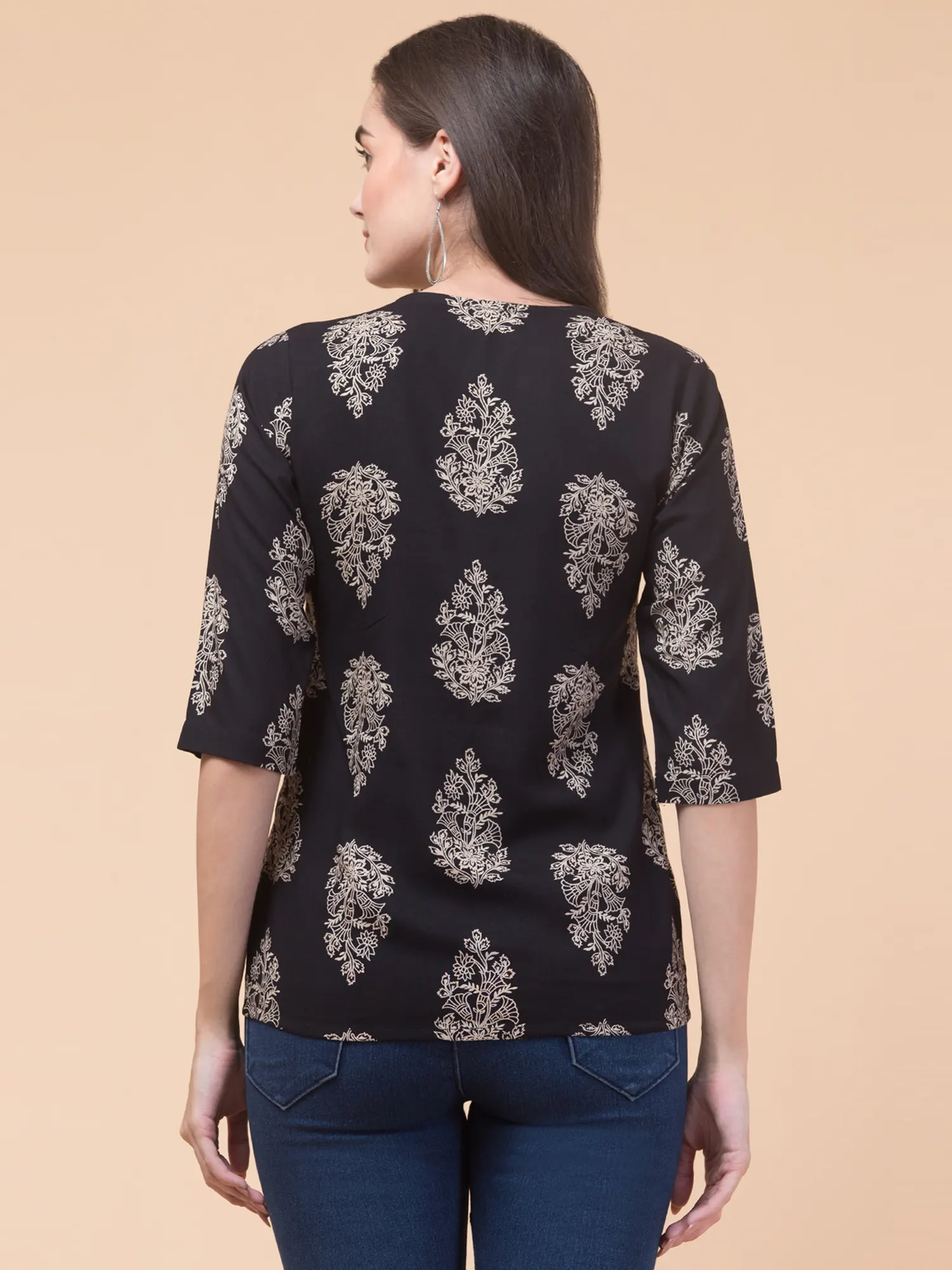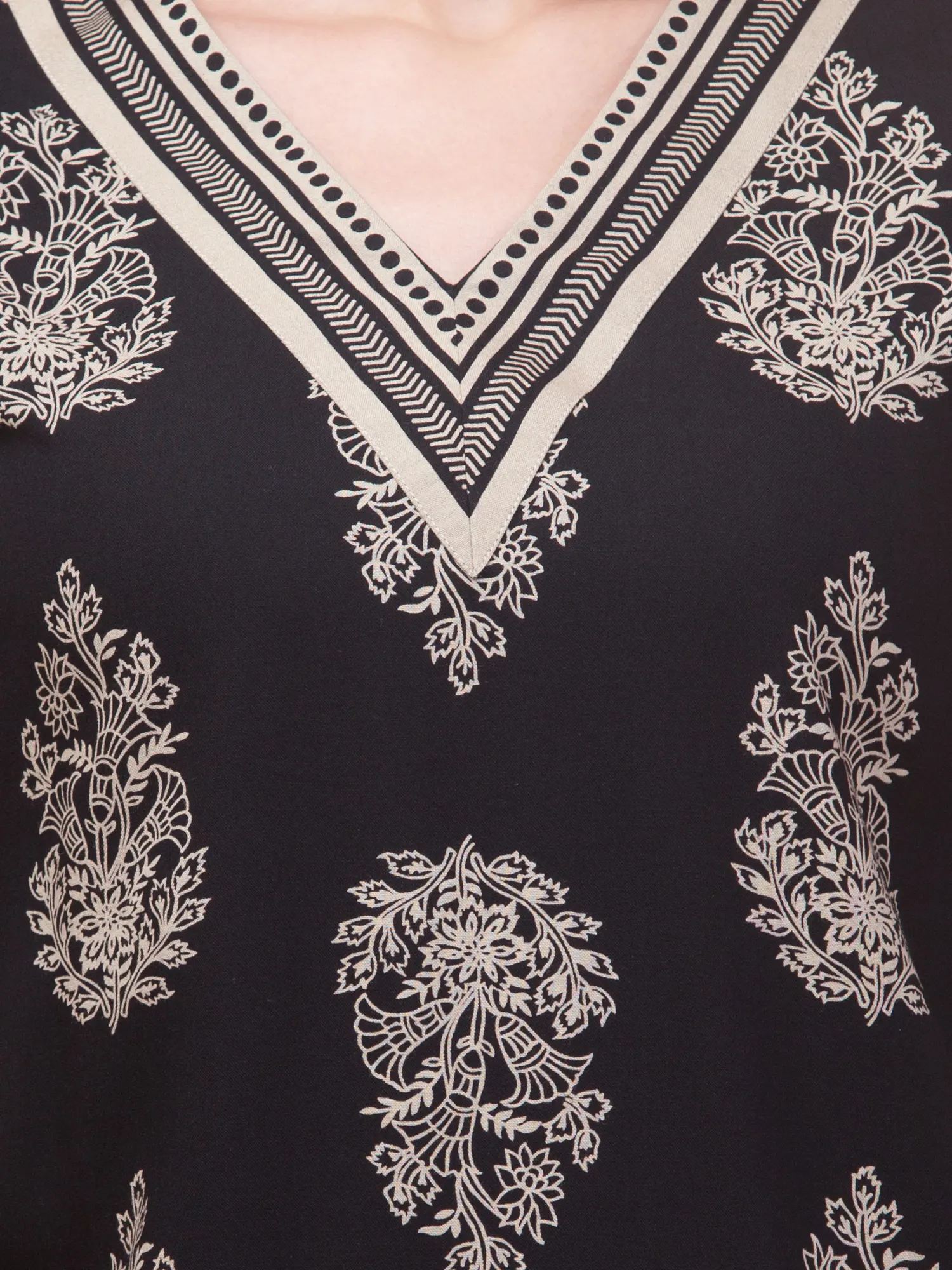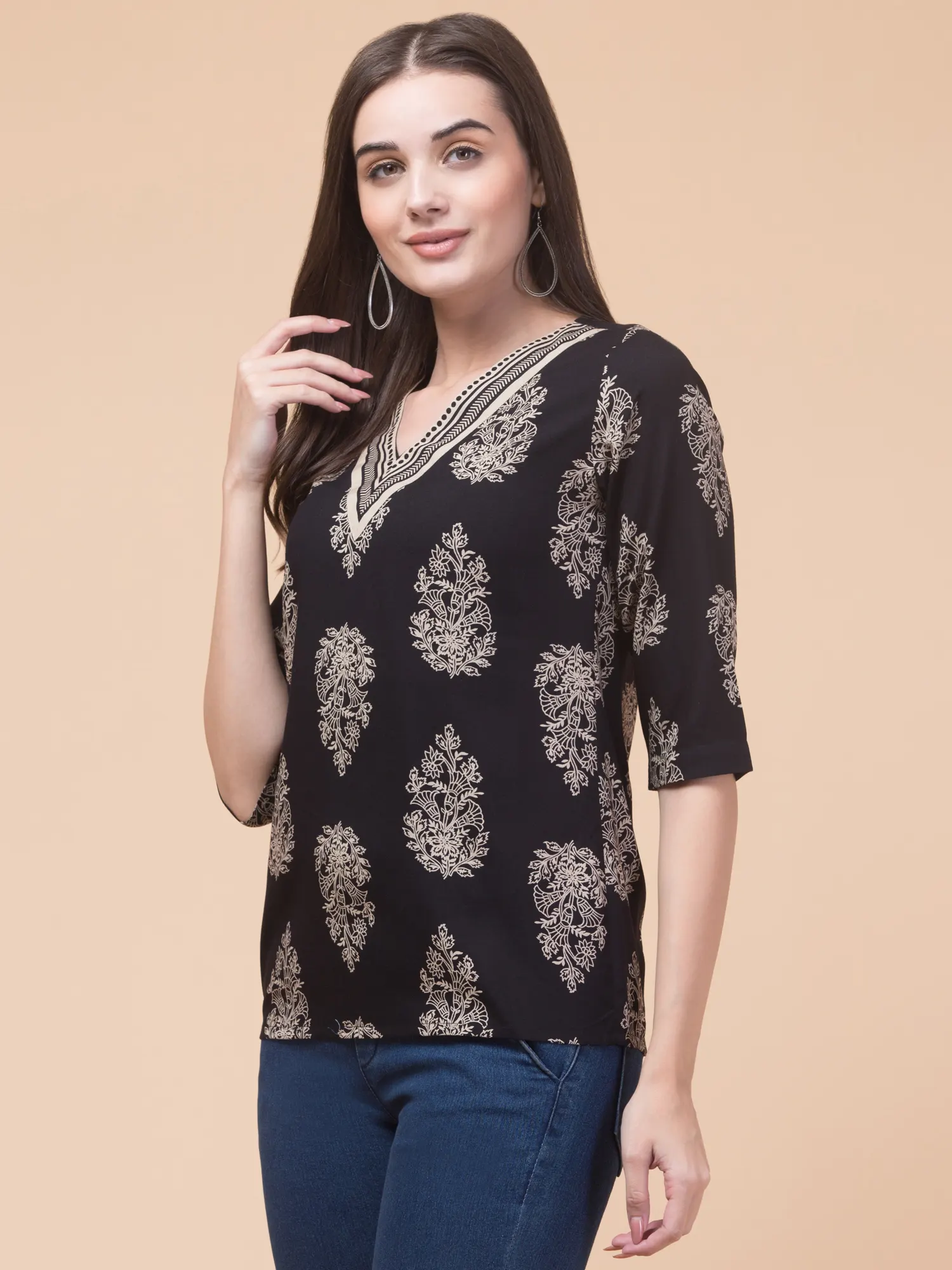 Upgrade your wardrobe with the Hive91 Women’s Black Jaipuri Print Rayon Kurti. Crafted from soft and breathable rayon fabric, this elegant kurti features a sophisticated black base adorned with an intricate white floral pattern. The stylish V-shaped neckline is enhanced with a decorative trim, adding a unique charm to the design. The three-quarter length sleeves provide a modern touch, making it perfect for both casual outings and festive occasions. Pair it with blue jeans, leggings, or palazzos for a versatile and fashionable look. Whether you’re heading to work, a family gathering, or a day out with friends, this kurti ensures comfort and style all day long.