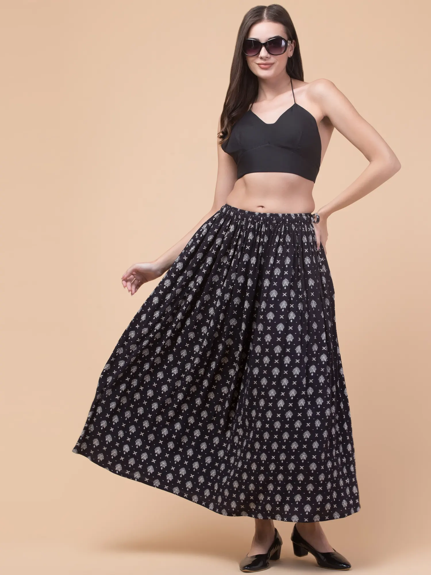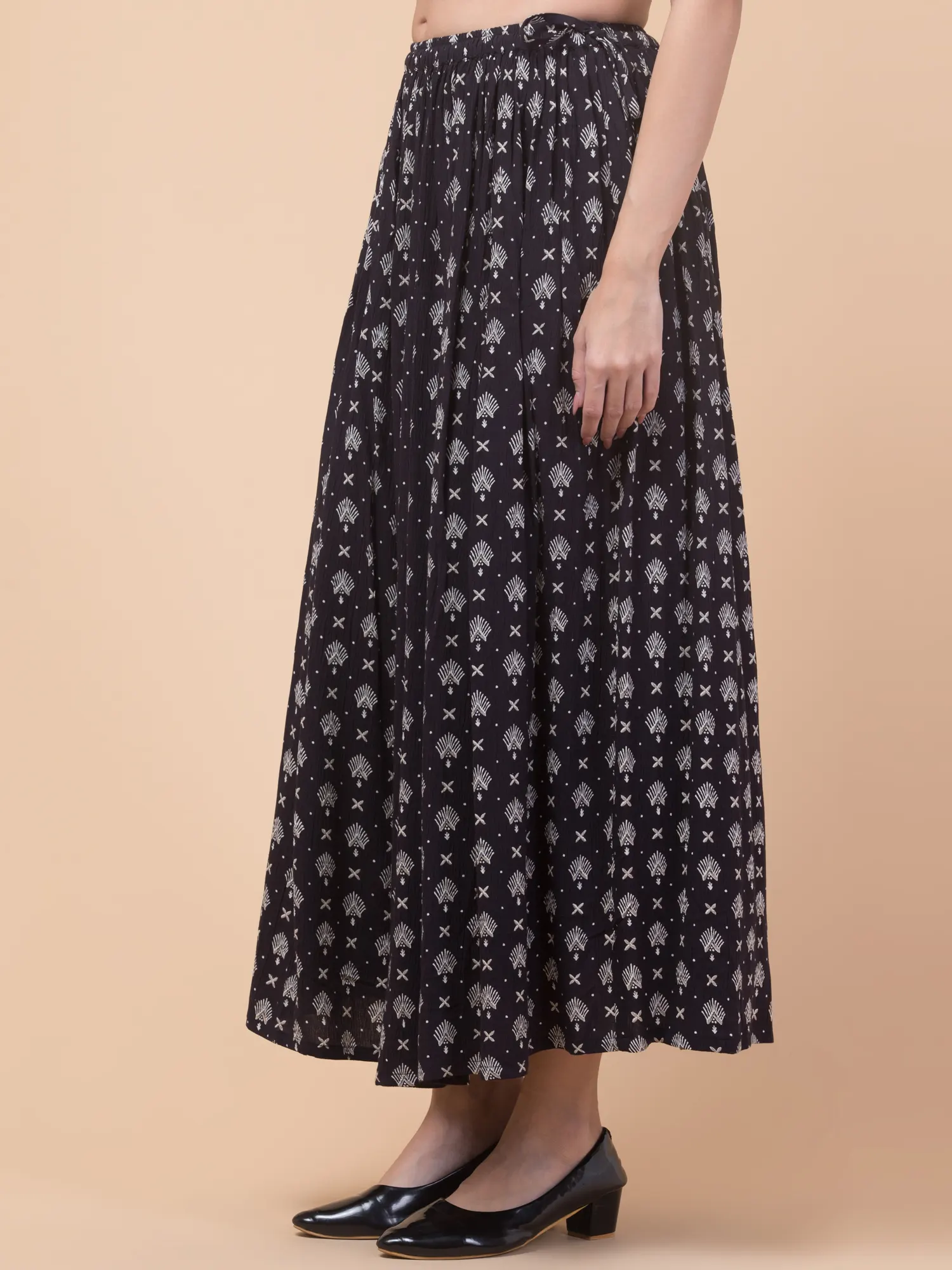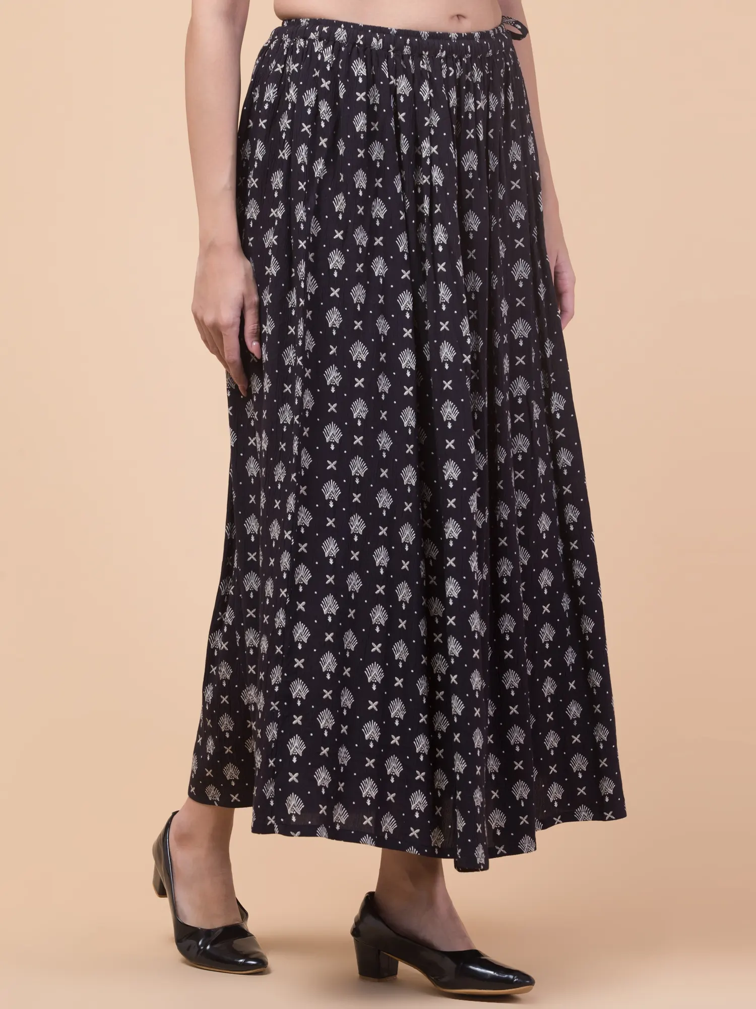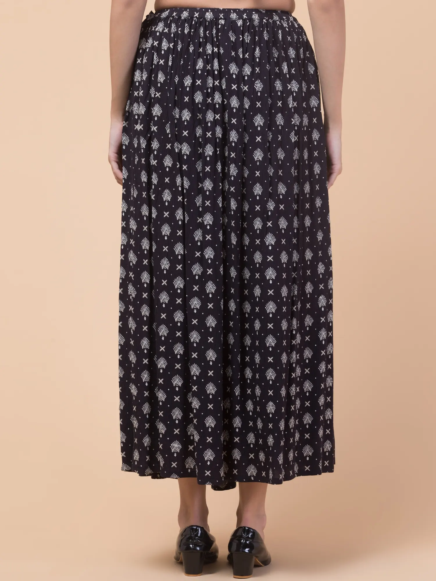 Women’s Black Floral Rayon Skirt, 36 Inches, Elastic Waistband. Add a touch of sophistication to your wardrobe with this stunning black ankle-length skirt from Hive91. Designed with a soft elastic waistband for a comfortable fit, this skirt features a striking white print of small geometric shapes and stylized floral motifs. The breathable rayon fabric ensures effortless wear, while the 36-inch length offers a versatile, elegant silhouette. Whether for casual outings or party wear, this skirt is a must-have for creating timeless looks. Pair it with black low-heeled shoes for the perfect ensemble.