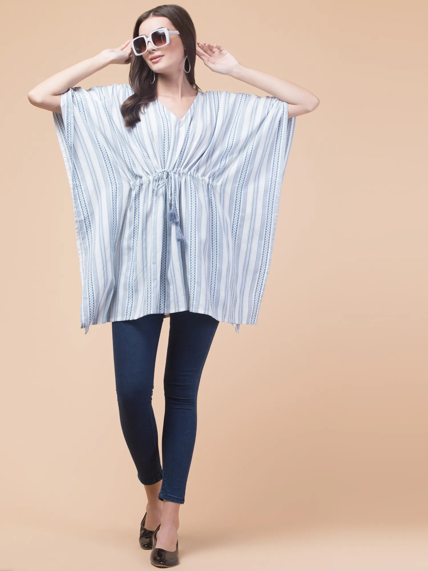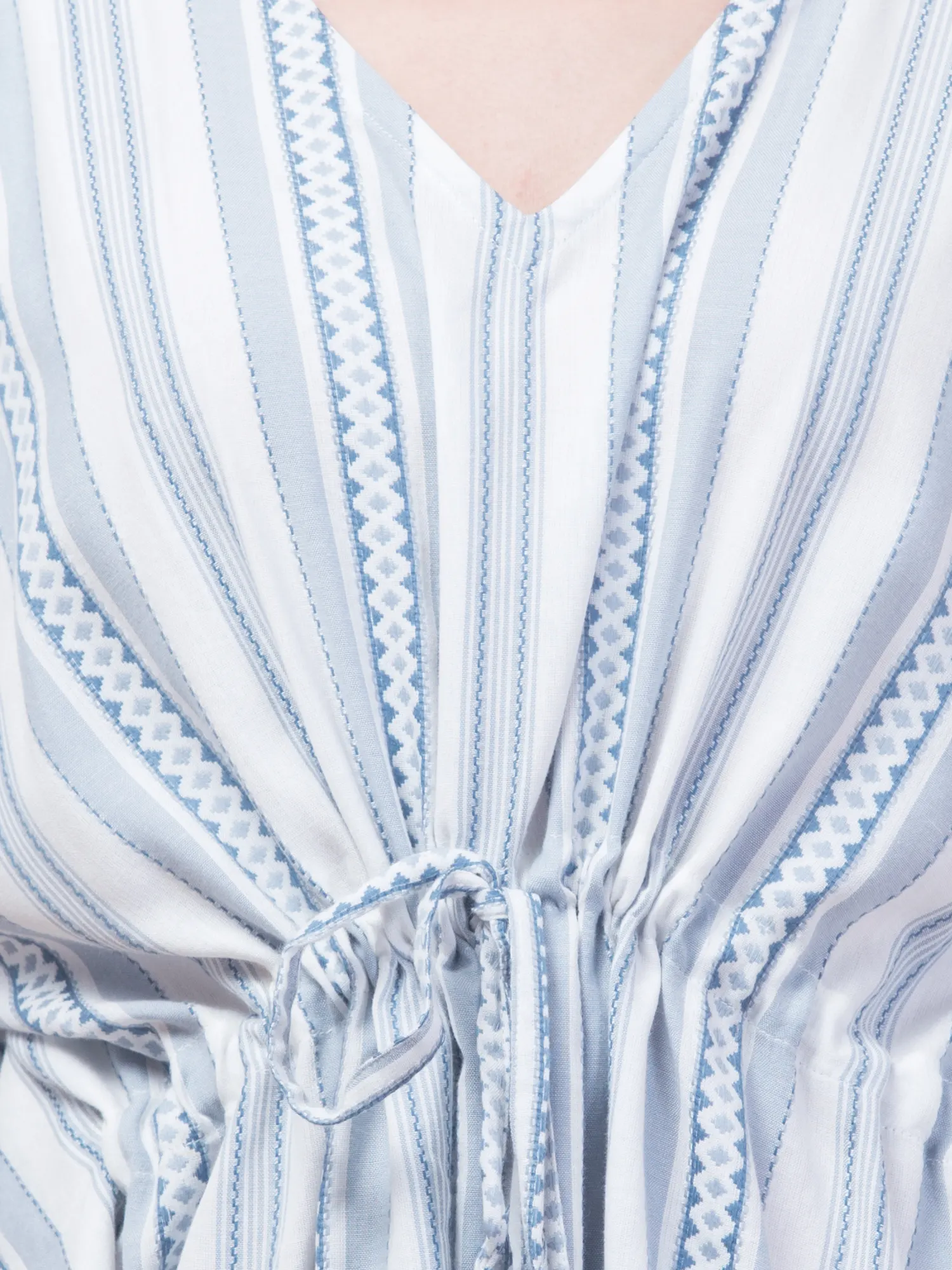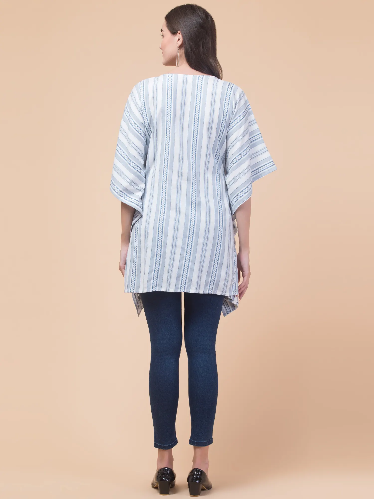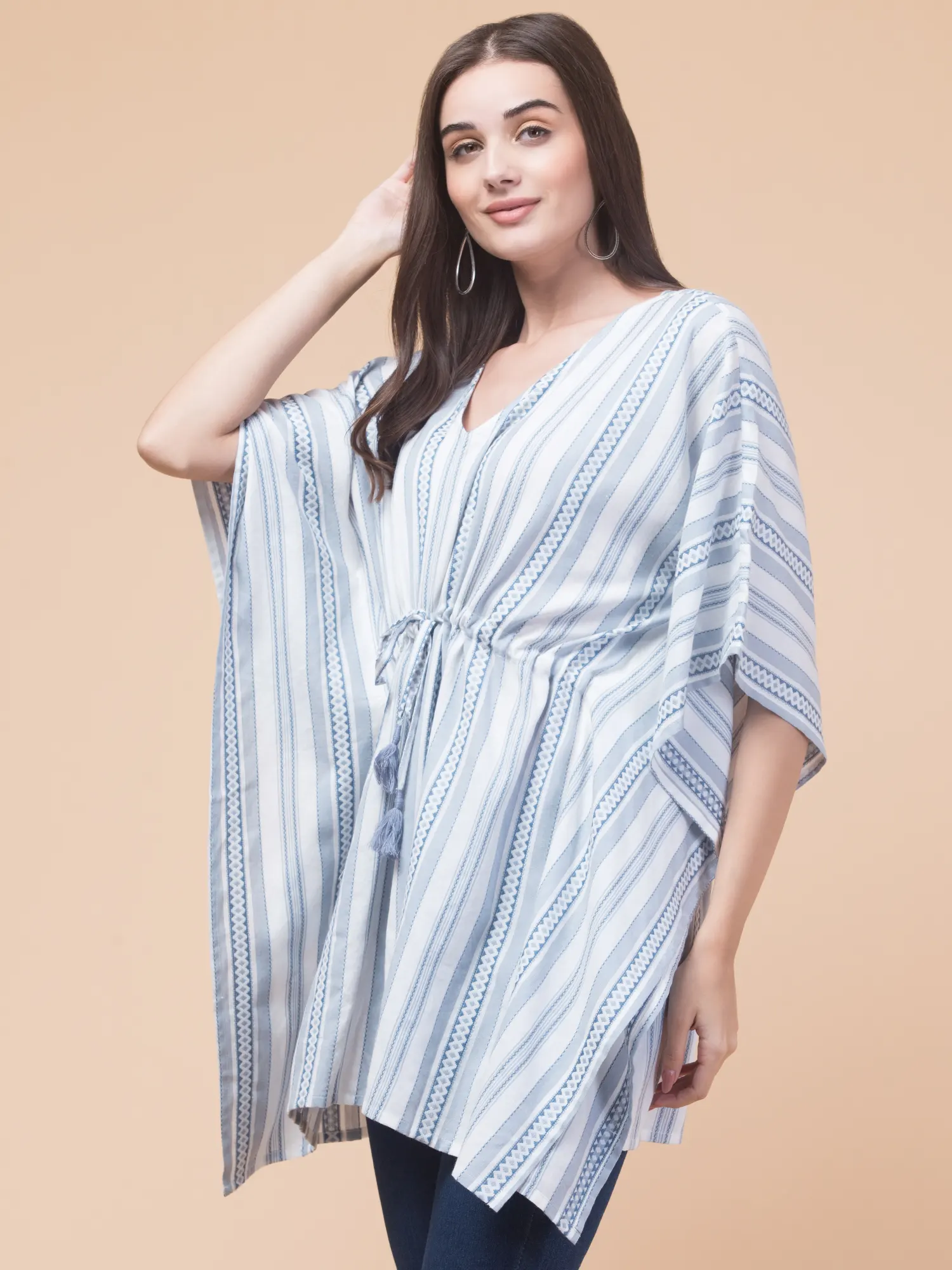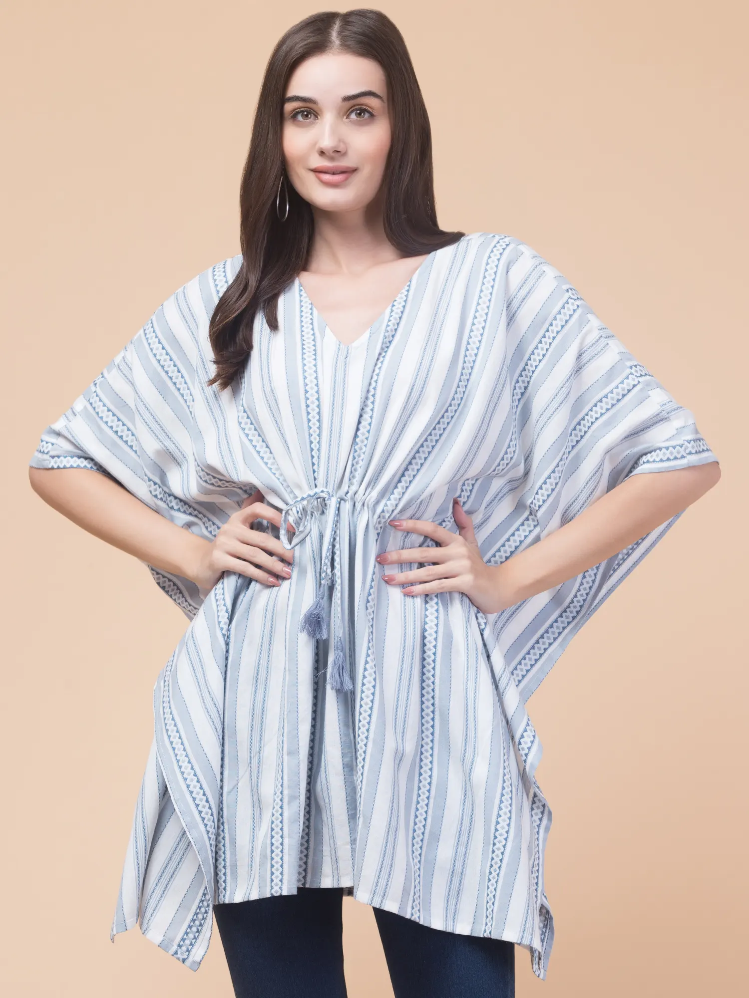 Stay stylish and comfortable with the Hive91 Women’s Blue Cotton Kaftan Top. Crafted from breathable cotton fabric, this kaftan features a light blue and white striped pattern with intricate geometric designs. The V-neckline and drawstring waist with tassels offer a customizable fit, while the wide, flowy sleeves add to the relaxed vibe. With its 36-inch length, this kaftan pairs perfectly with jeans or leggings, making it ideal for casual outings or lounging in style.