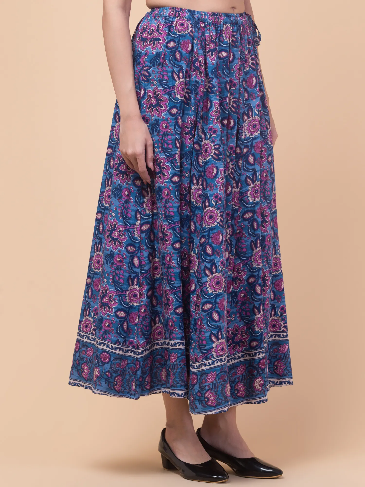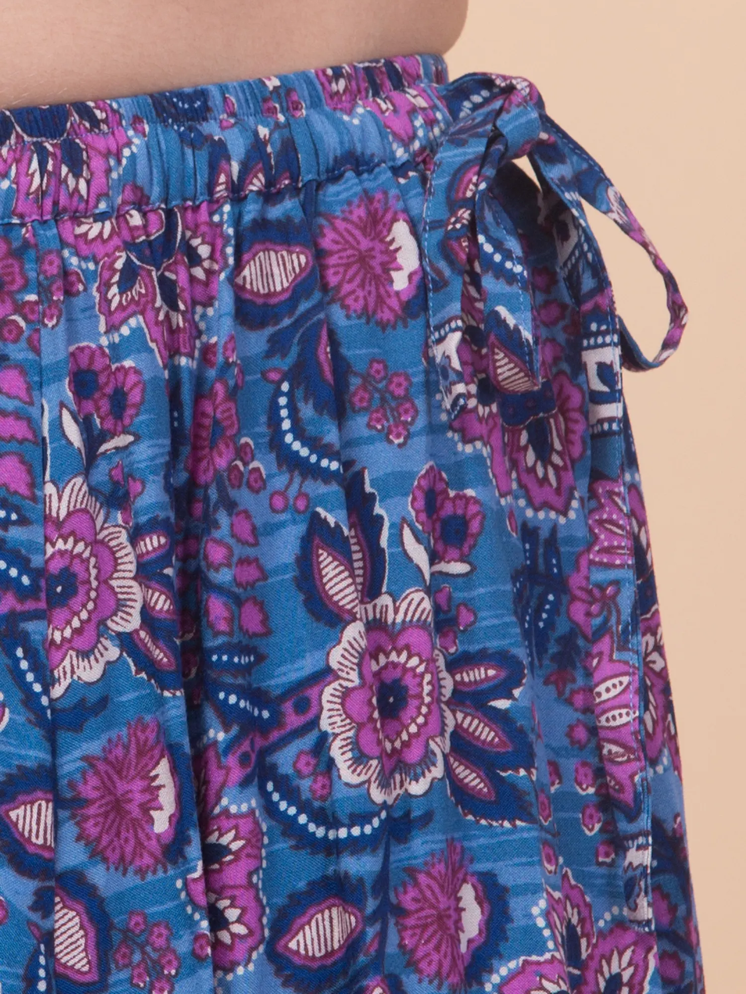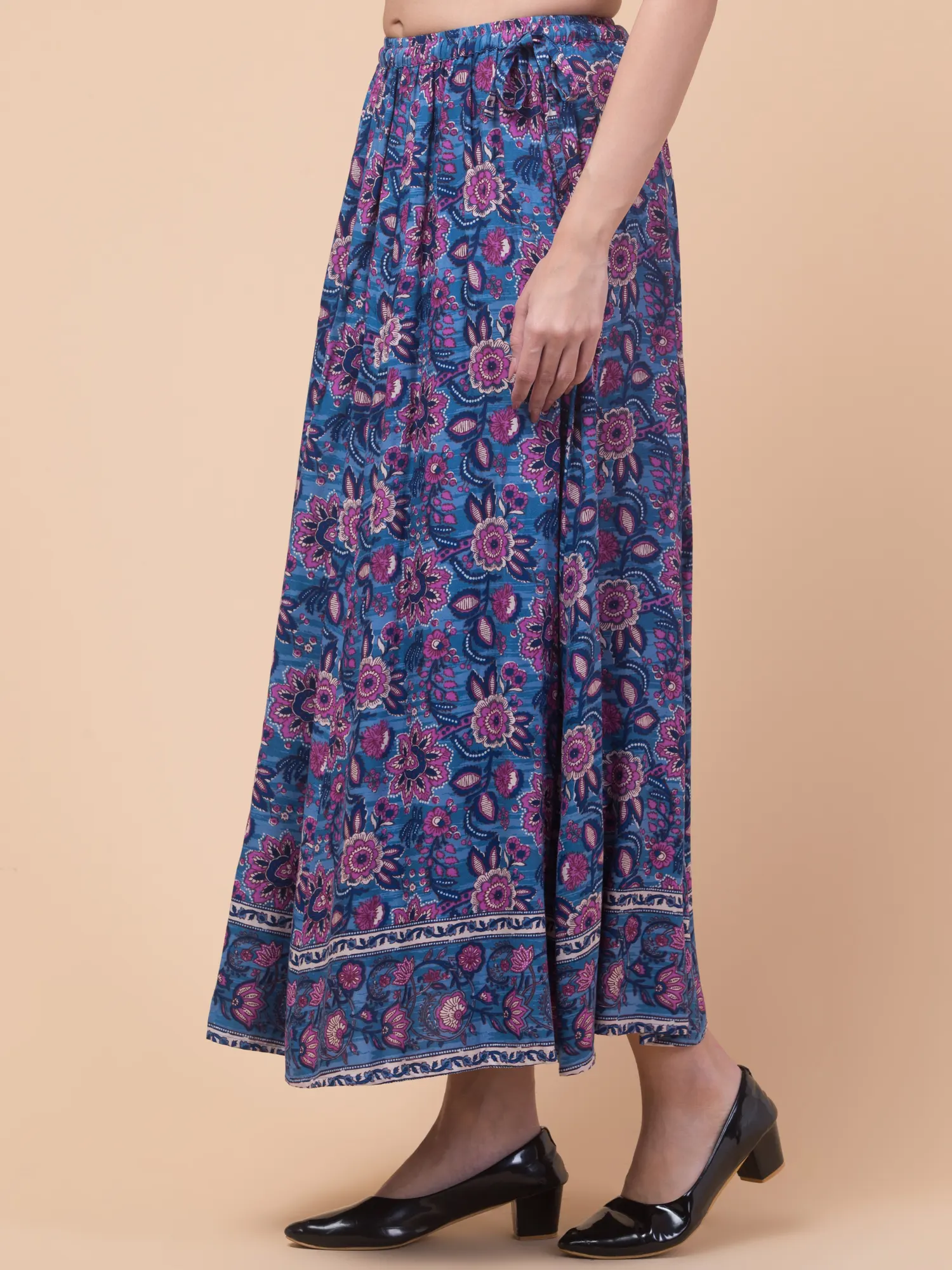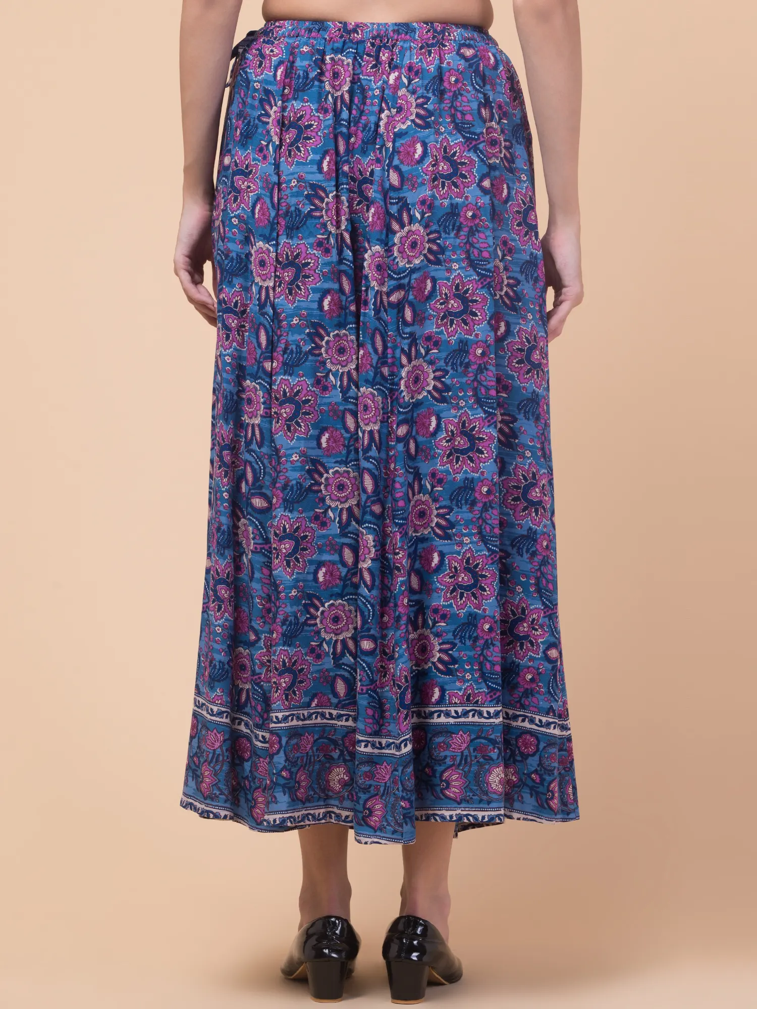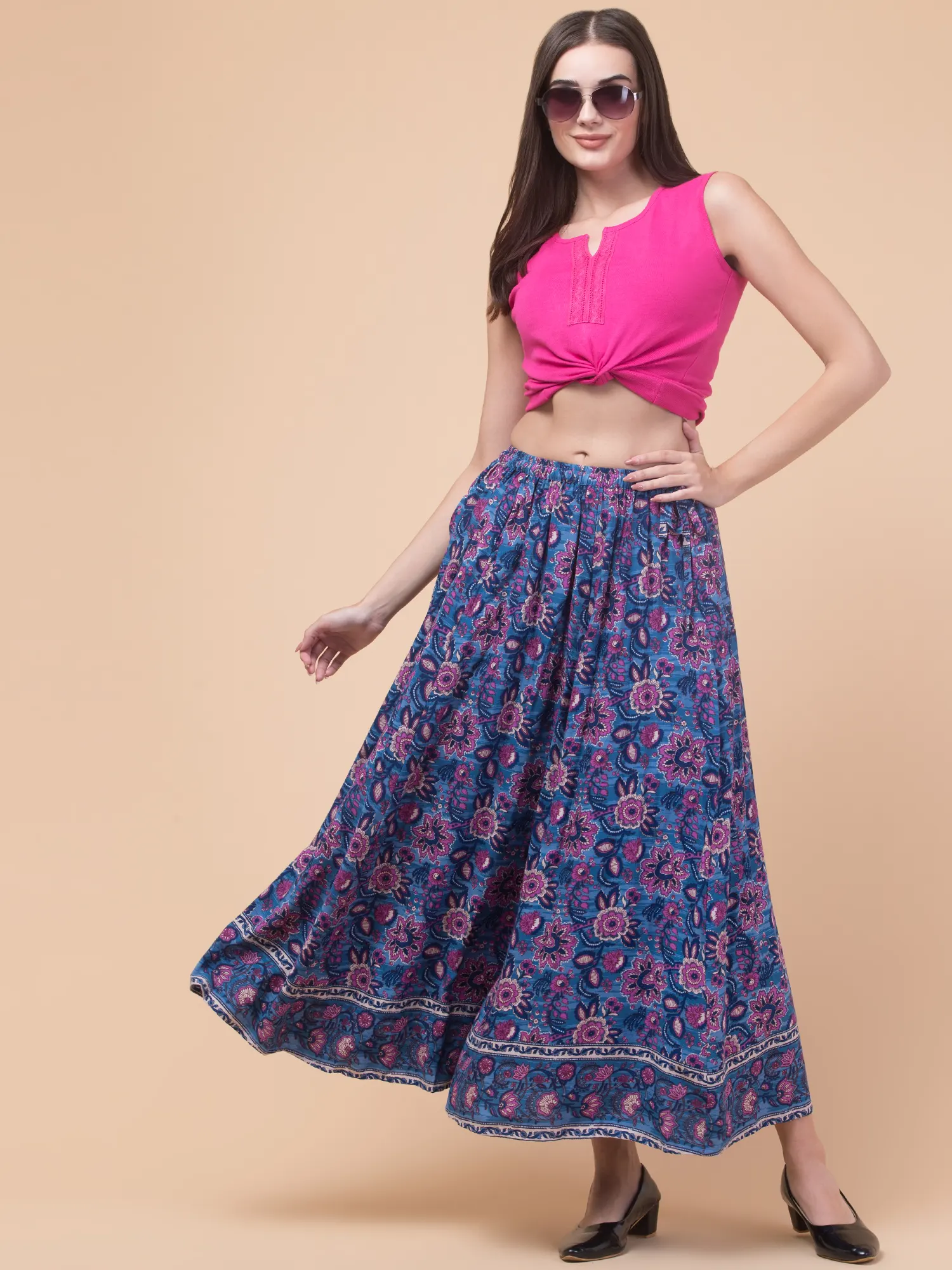 Brighten up your wardrobe with the Hive91 Women’s Blue Rayon Long Skirt, featuring a vibrant floral pattern in shades of pink, purple, and white. Crafted from soft, breathable rayon fabric, this 36-inch ankle-length skirt offers a flowy silhouette perfect for both casual and semi-formal occasions. The elastic waistband ensures a comfortable and flexible fit, while the decorative border at the hem adds an elegant finishing touch. Pair it with your favourite top and low-heeled shoes for a chic, effortless look.