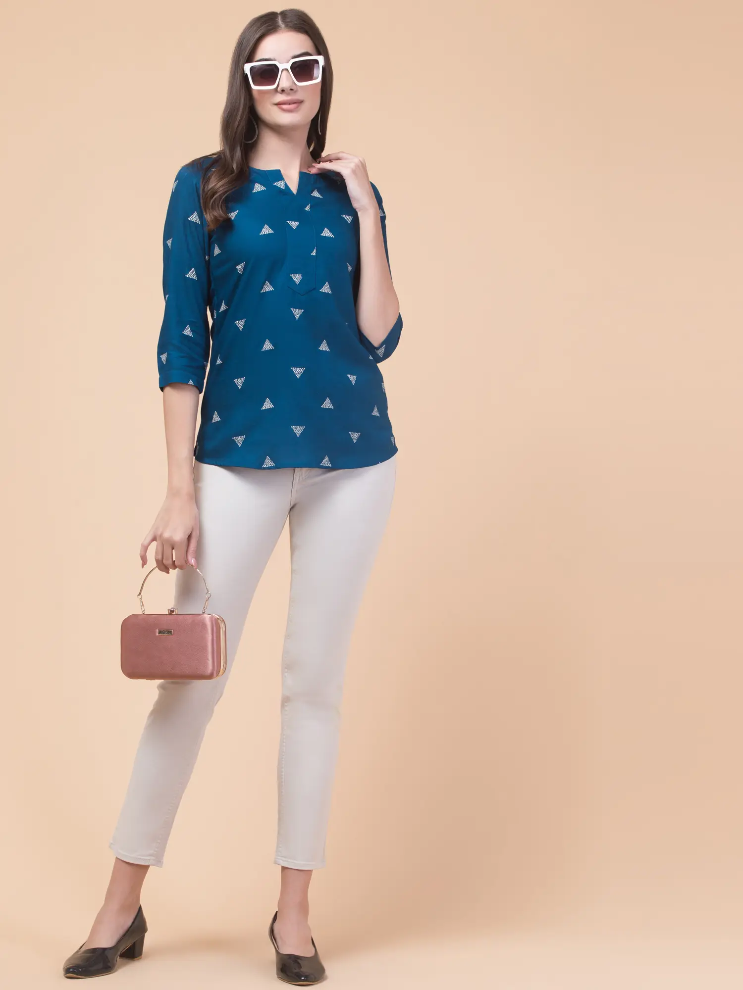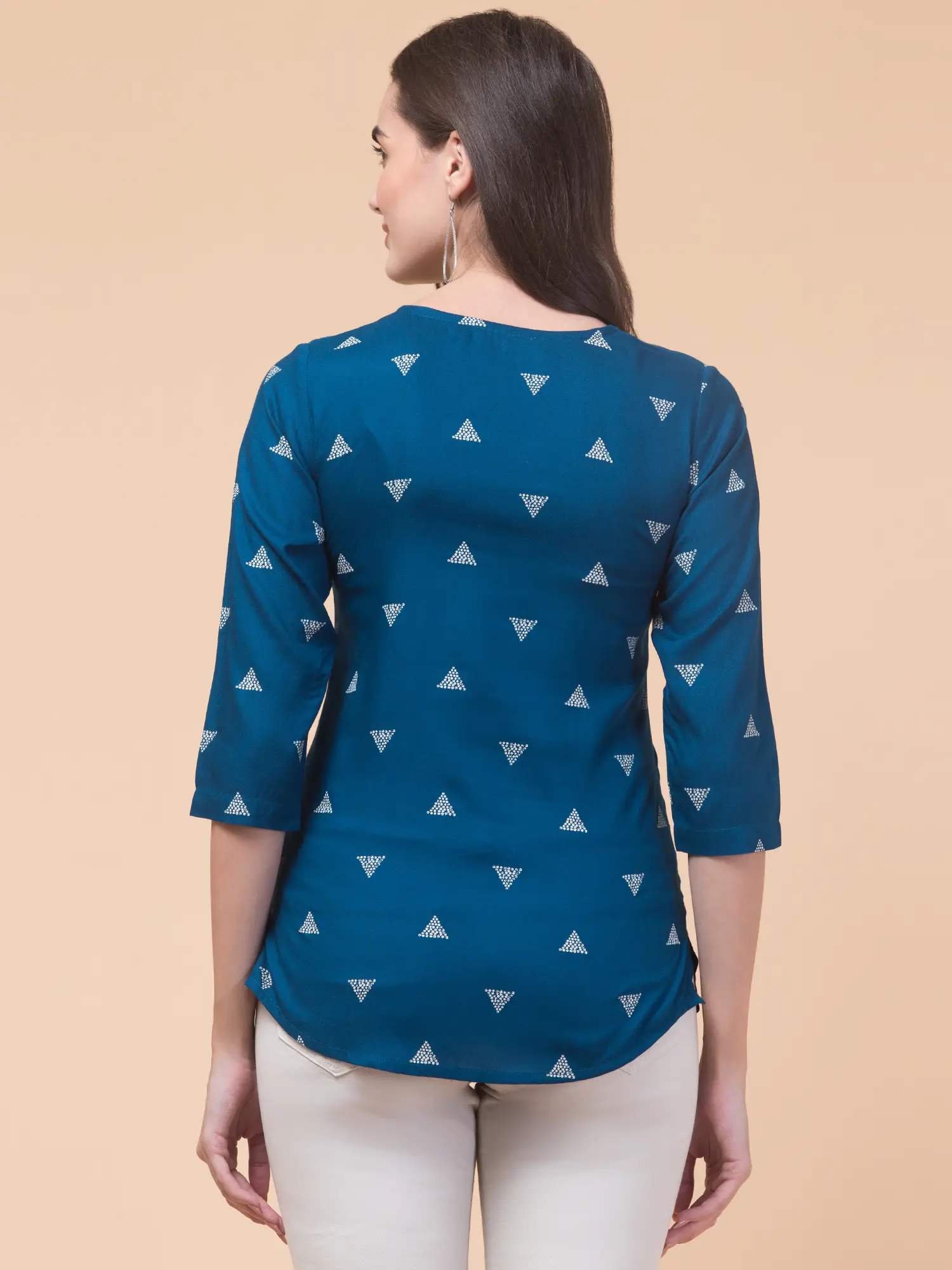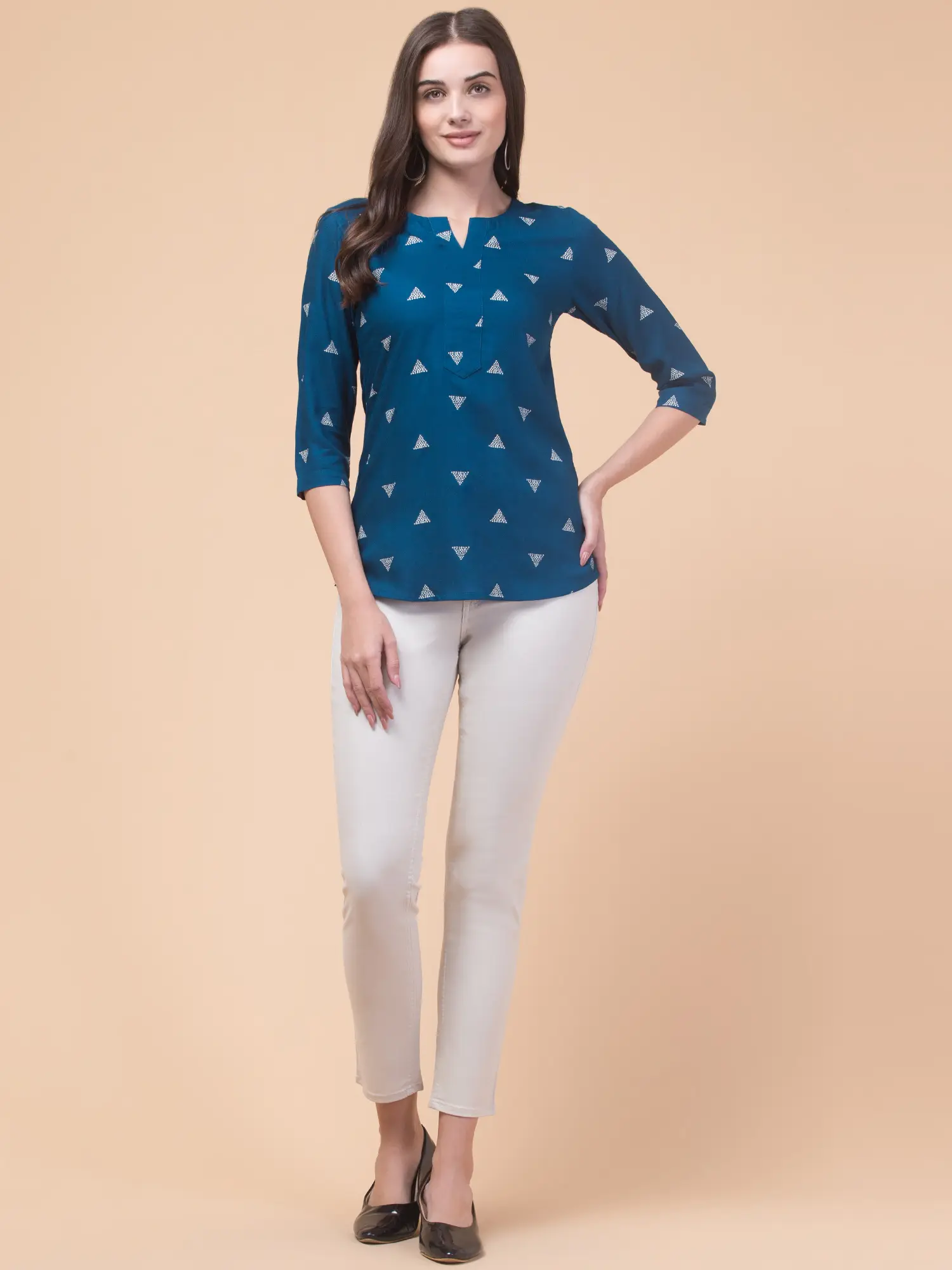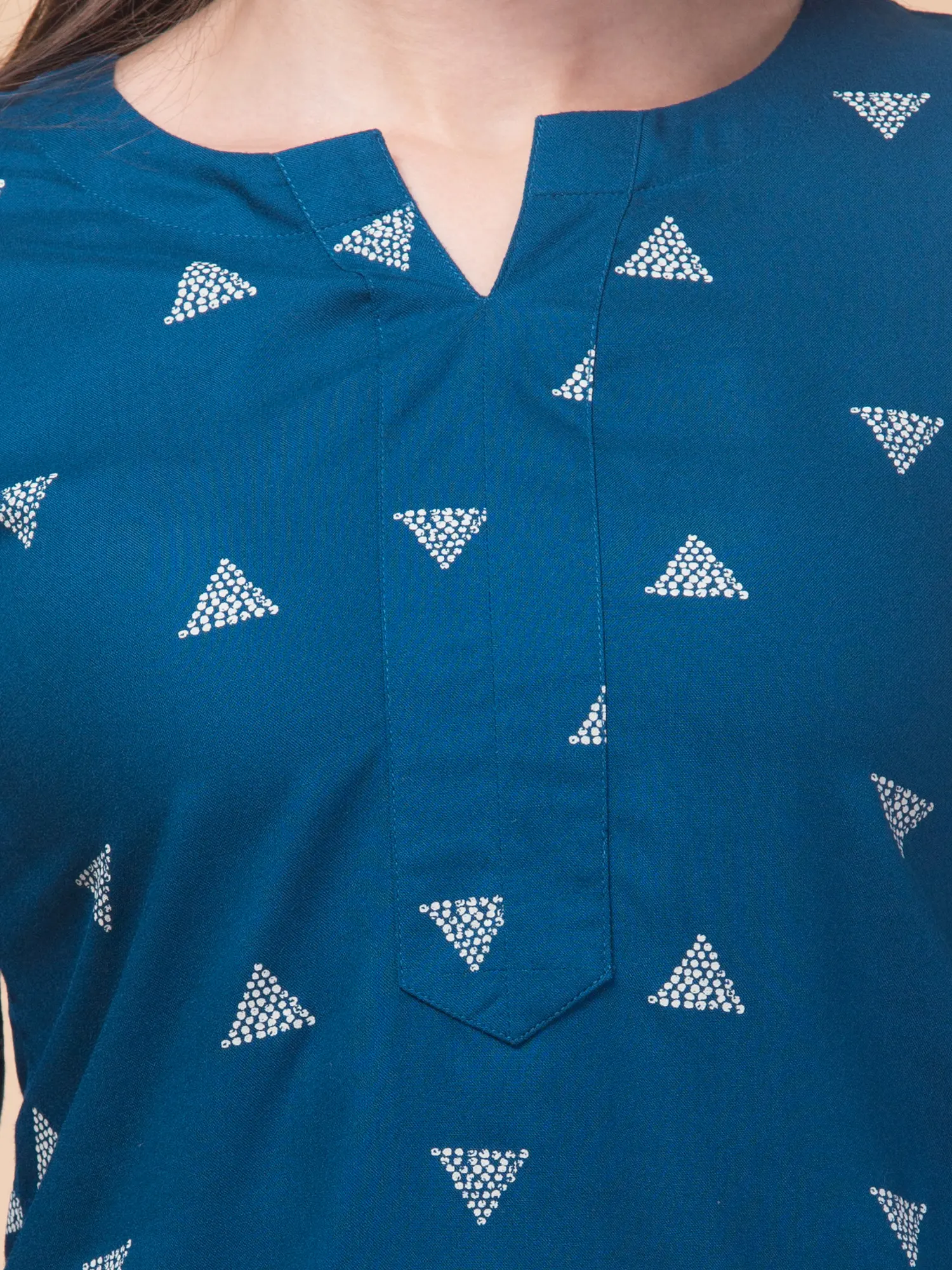 Add elegance to your wardrobe with the Hive91 Women’s Dark Blue Jaipuri Print Rayon Kurti. Made from soft and breathable rayon, this kurti features a stylish dark blue base with a charming white triangle pattern. The V-shaped neckline with a small notch adds a modern touch, while the three-quarter length sleeves ensure comfort and style. Perfect for casual outings, office wear, and festive occasions, this versatile kurti pairs beautifully with jeans, leggings, or palazzos.