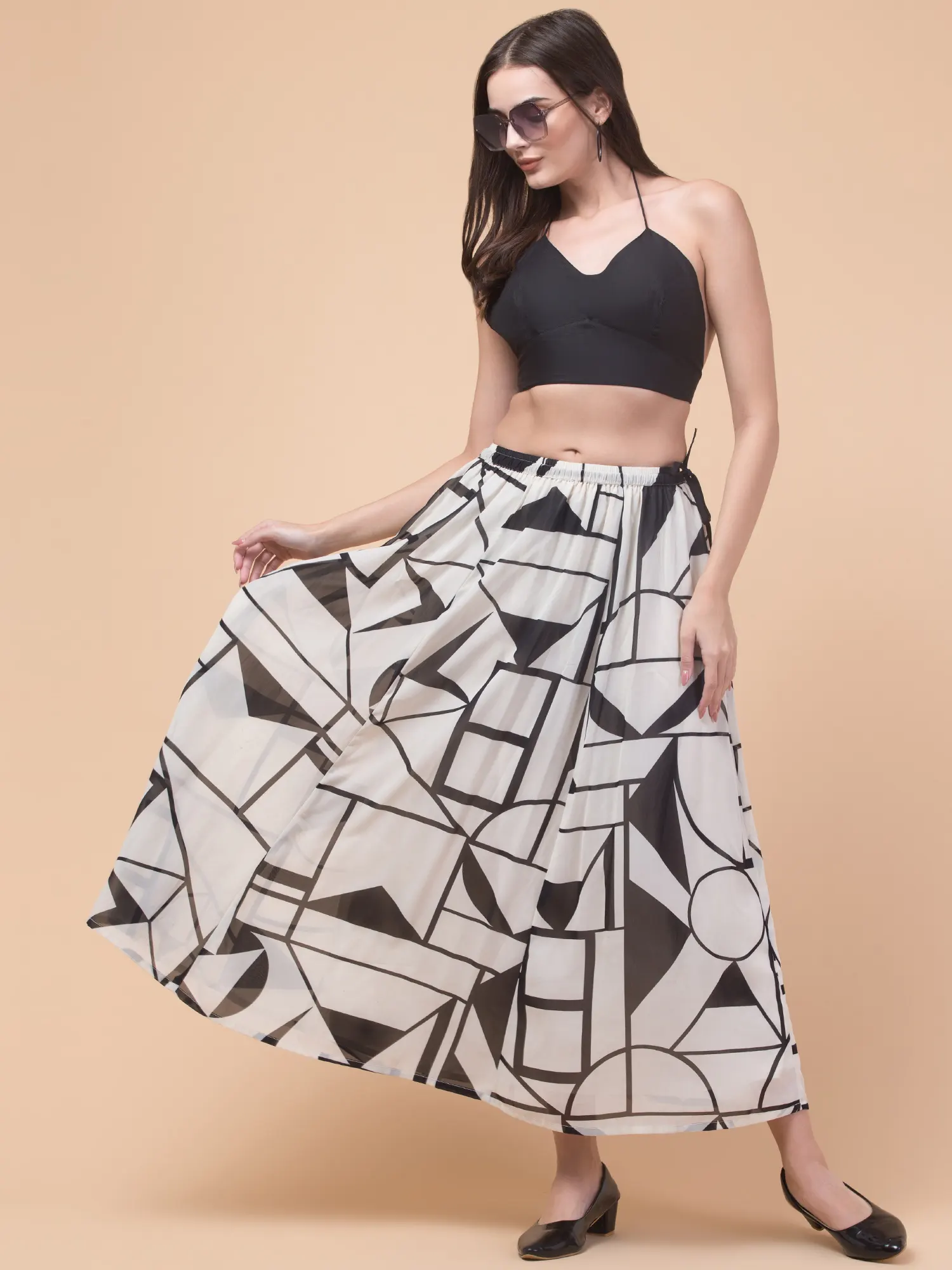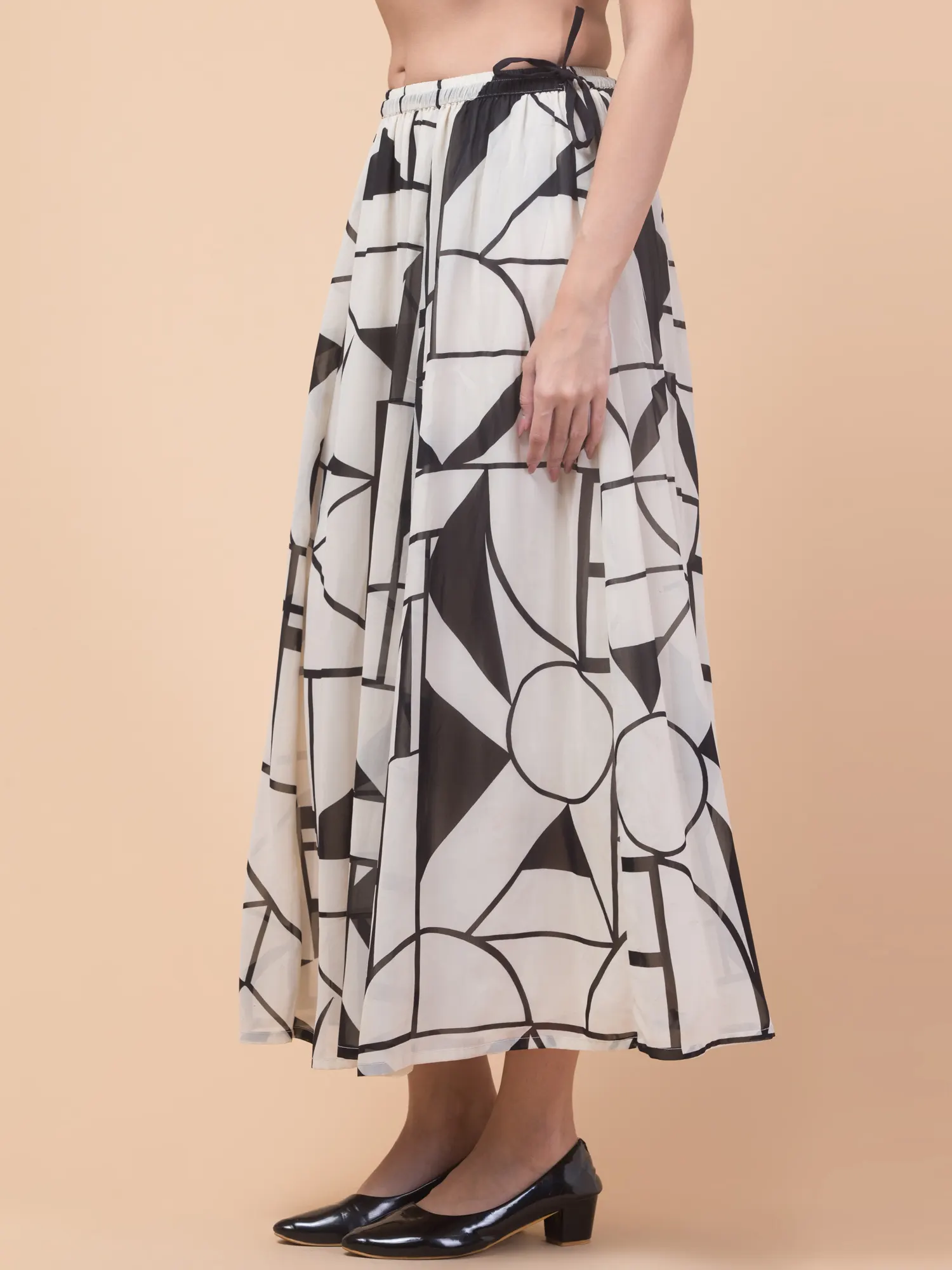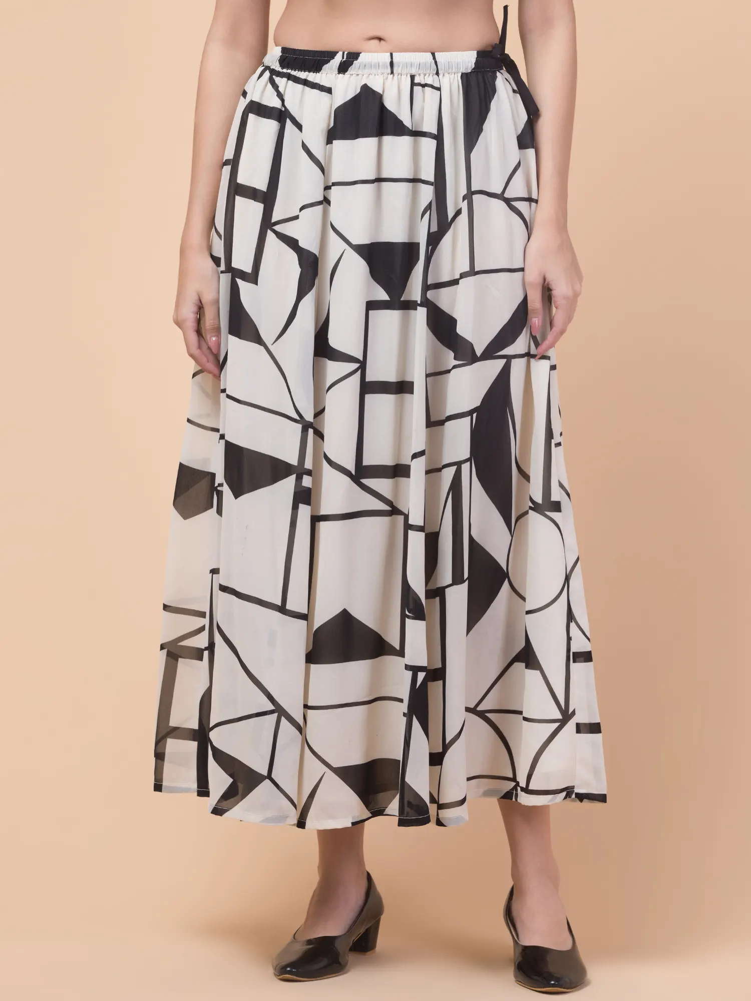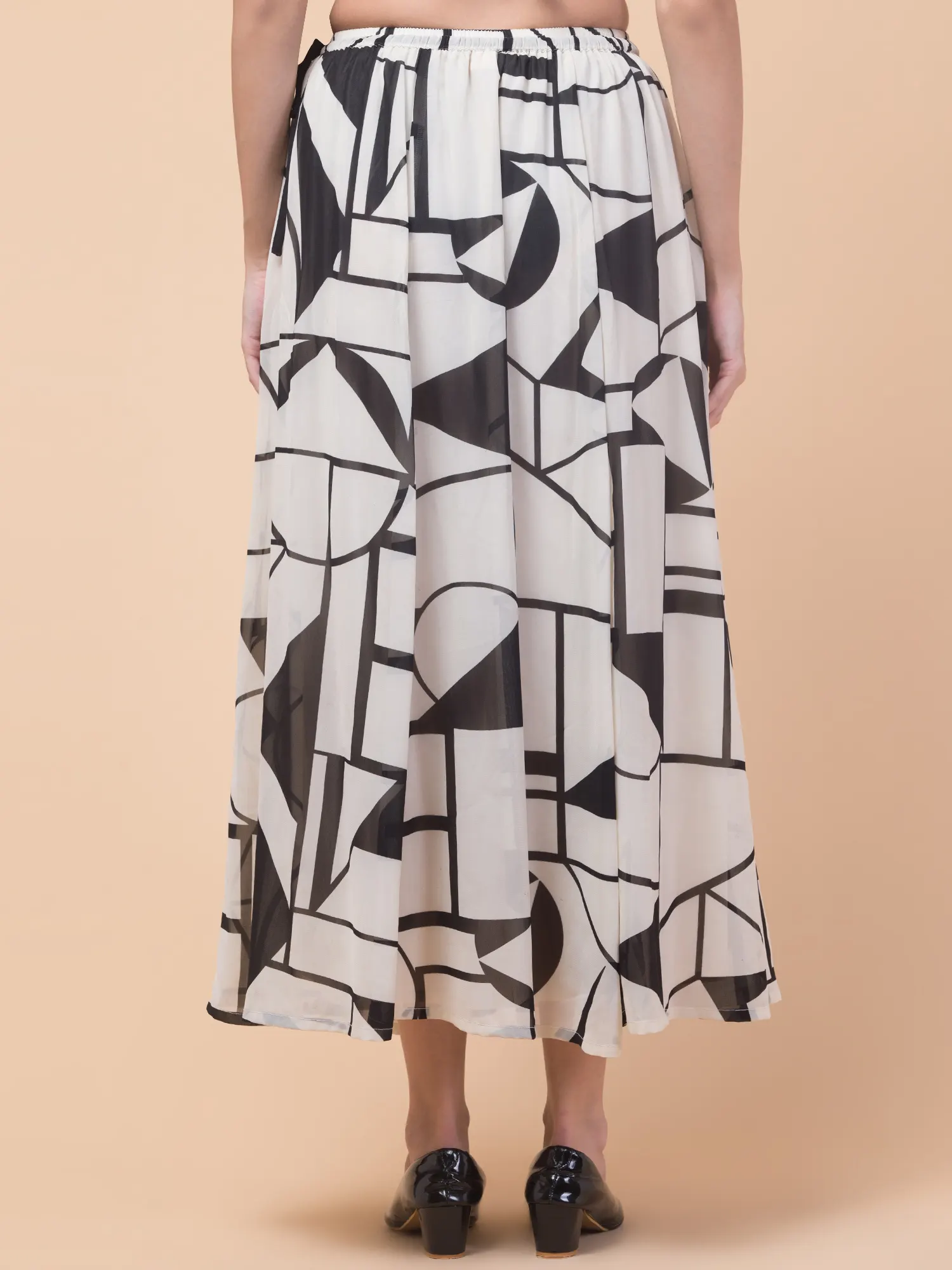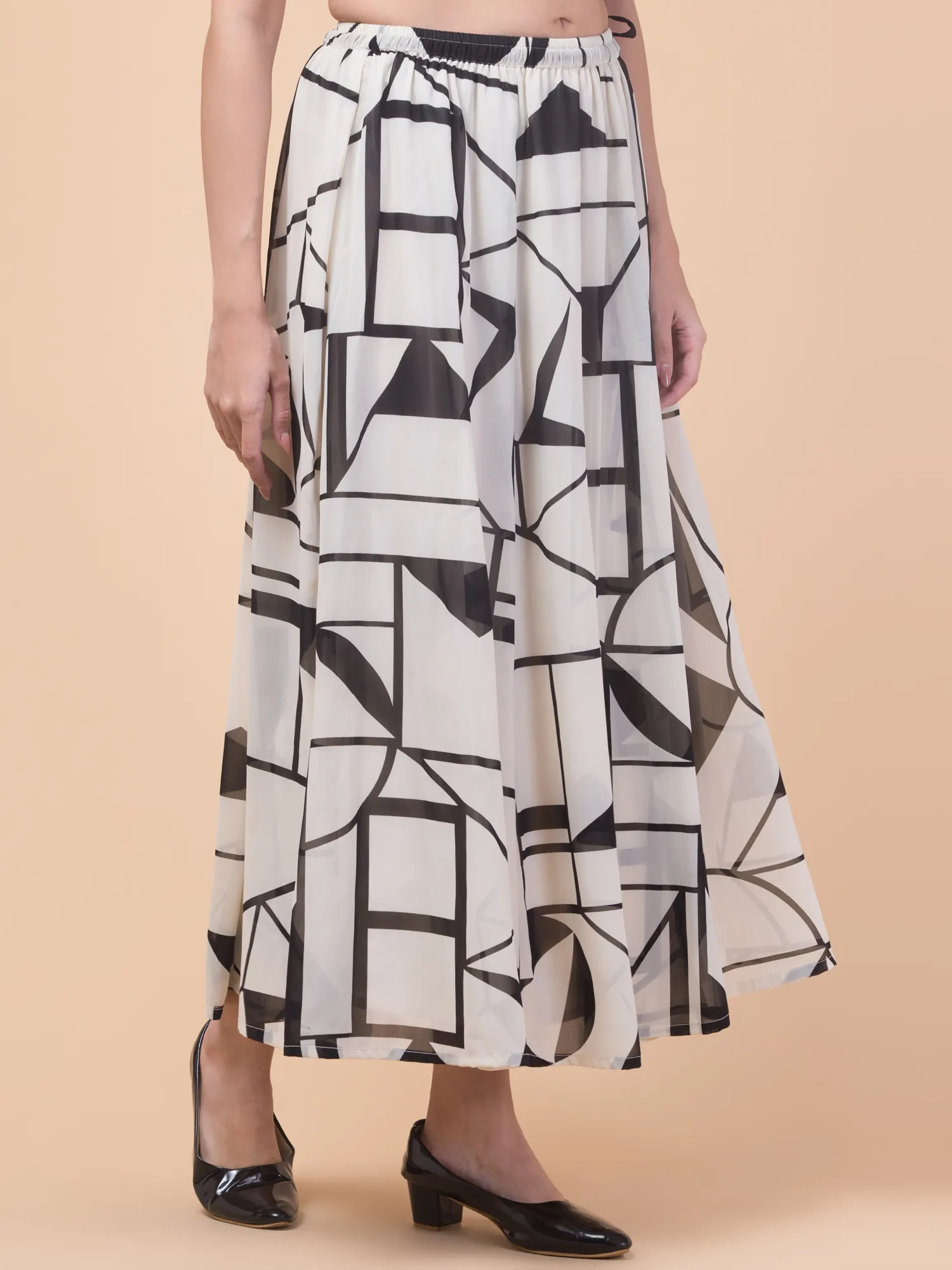 Add a modern touch to your wardrobe with the Hive91 Women’s Off-White Georgette Long Skirt. Featuring a bold black geometric pattern with shapes like rectangles, triangles, and lines, this skirt combines contemporary style with everyday comfort. Crafted from lightweight, slightly sheer georgette fabric, it offers a breezy, flowy silhouette perfect for warm days. The elastic waistband ensures a snug yet flexible fit, while the 36-inch length adds elegance to your look. Pair it with a fitted top and black low-heeled shoes for an effortlessly chic outfit.