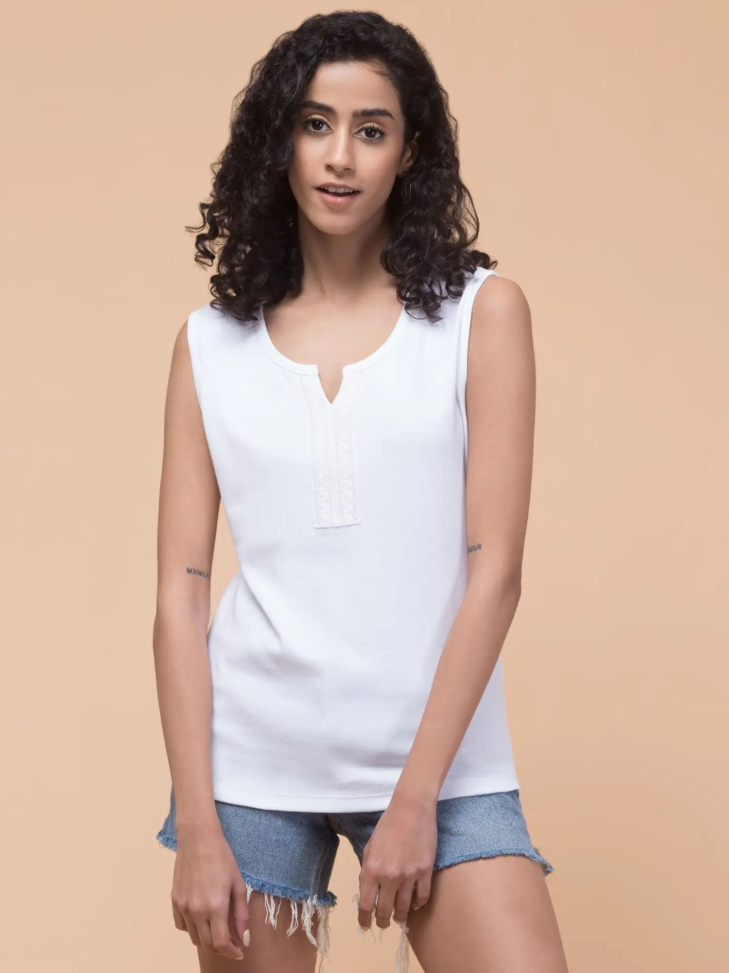 This sleeveless t-shirt is crafted from soft and breathable cotton, offering exceptional comfort for all-day wear. Its pristine white hue exudes elegance, while the delicate lace trim adorning the V-neckline adds a touch of femininity and sophistication.
